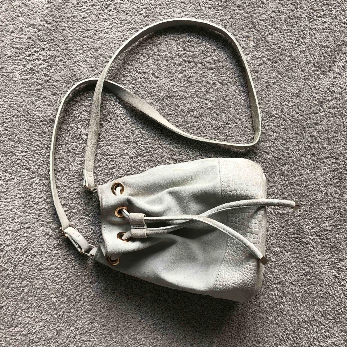 Suede premium väska i färgen ljusgrå med guld detaljer. Frakt tillkommer på 50kr