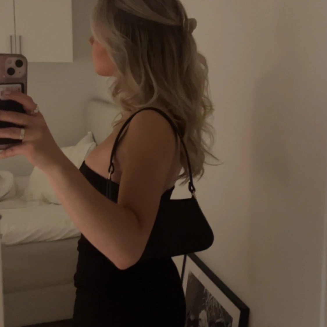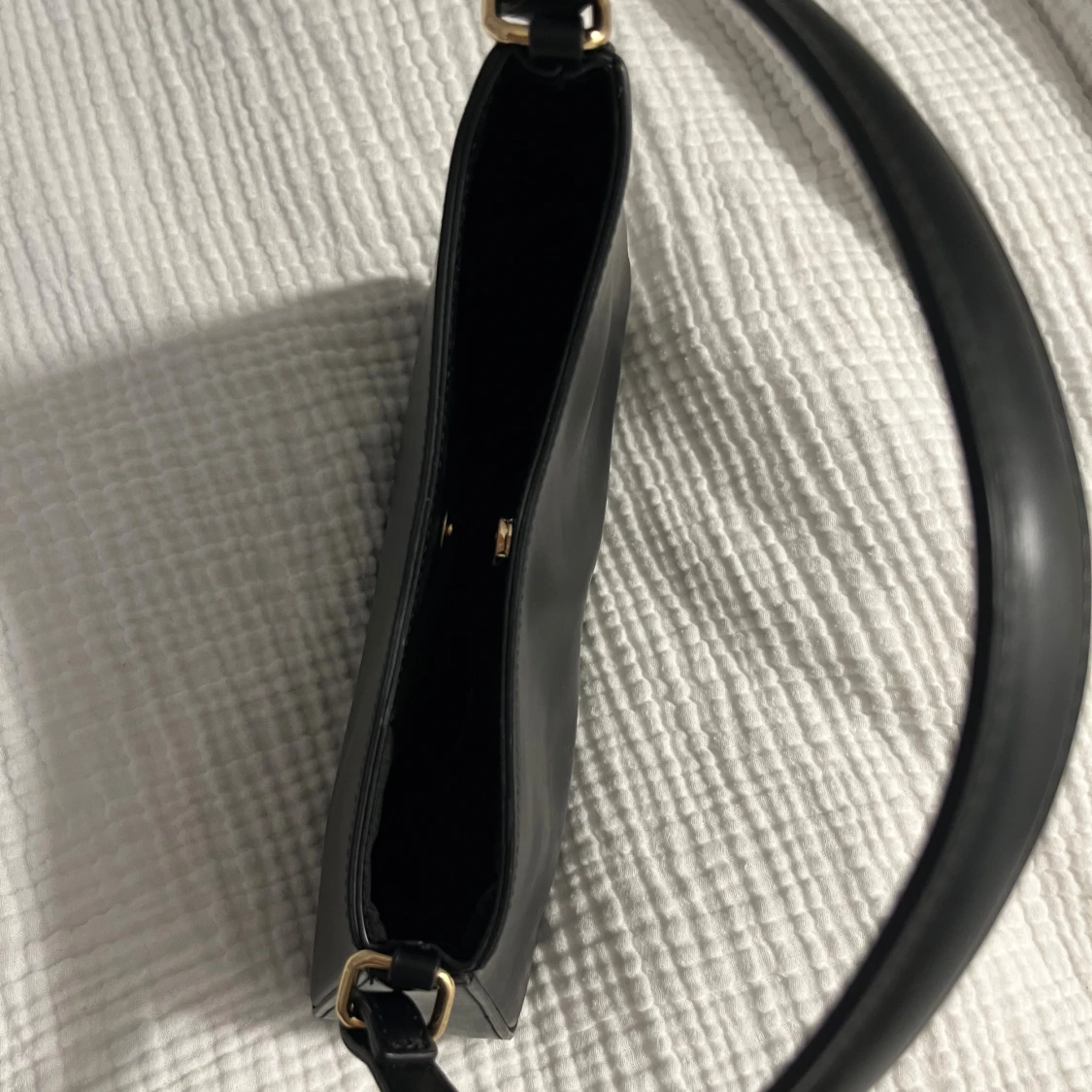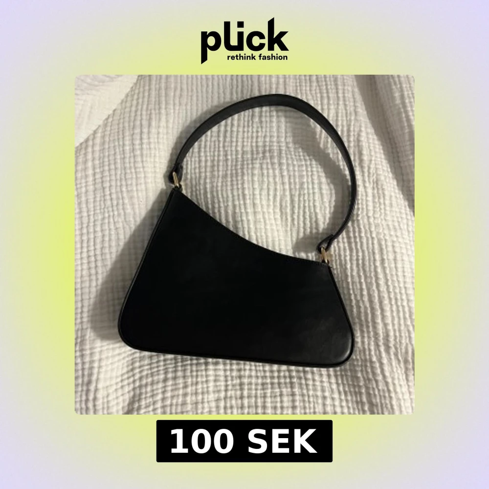 Snygg svart axelväska med stilren, asymmetrisk form och guldfärgade metalldetaljer. Säljer för köpte till en finsittning och har inte kommit till användning efter det🫶