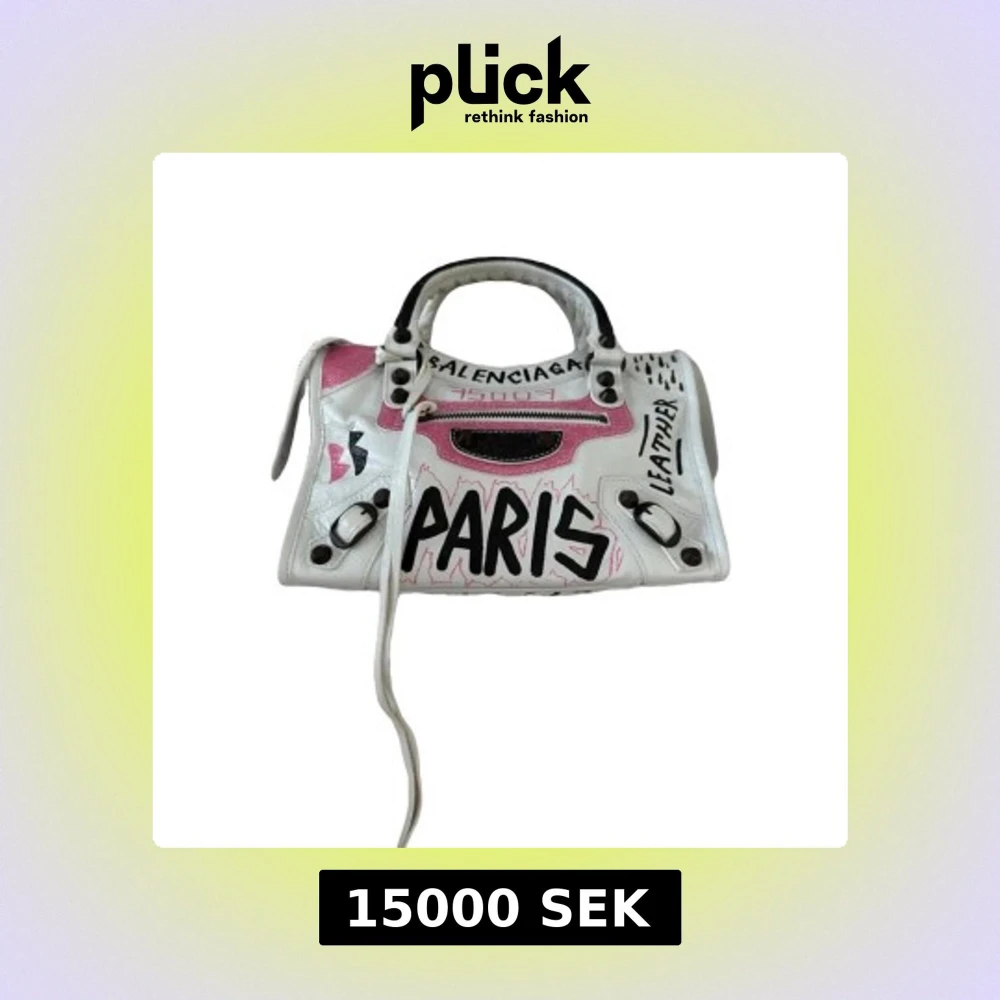 Cool vit handväska från Balenciaga med graffititryck i svart och rosa. Väskan har handtag med flätad detalj, dragkedja framtill och unika handmålade texter som 'PARIS' och 'LEATHER'. Tillverkad i skinn och har svarta metalldetaljer. Perfekt statement piece för dig som vill sticka ut.