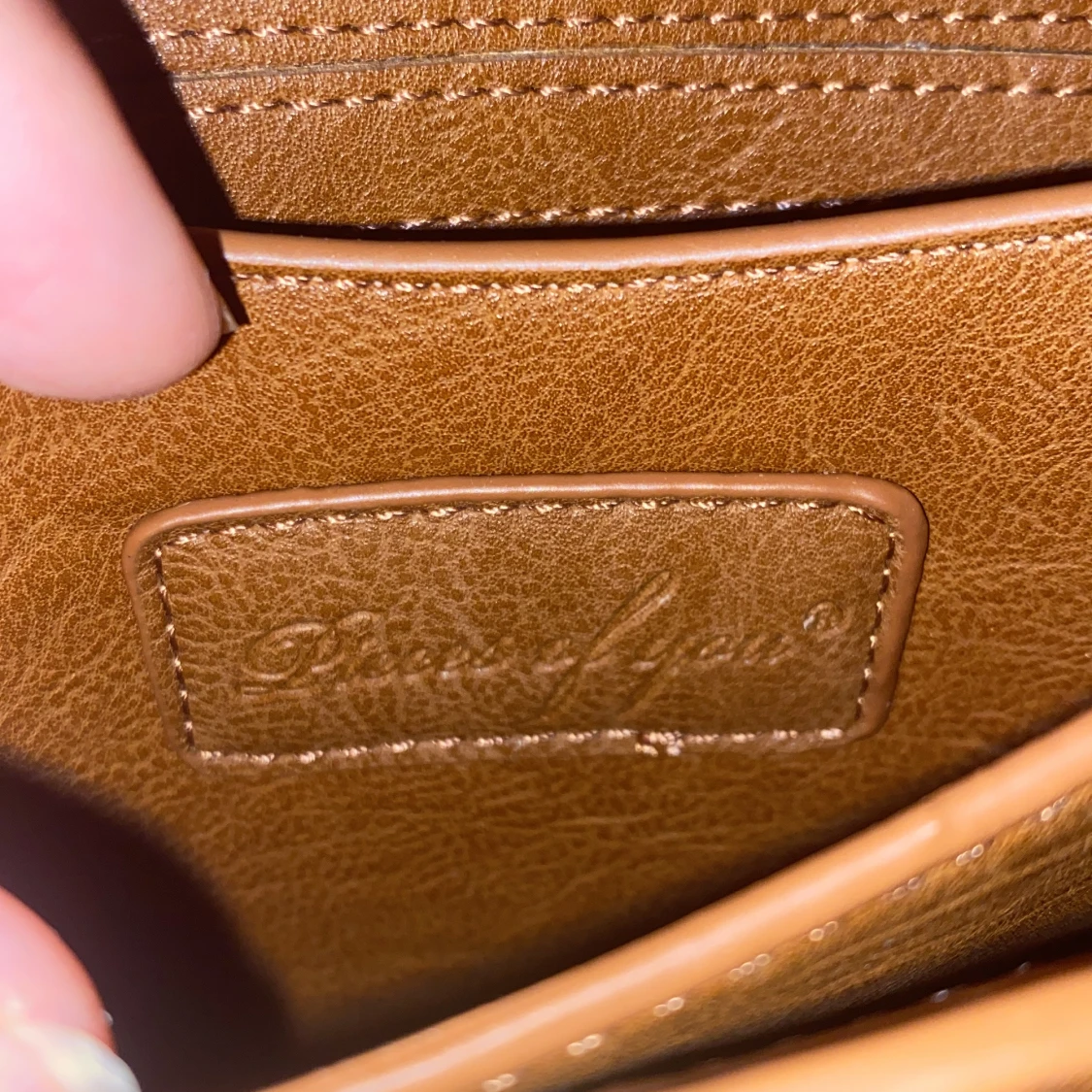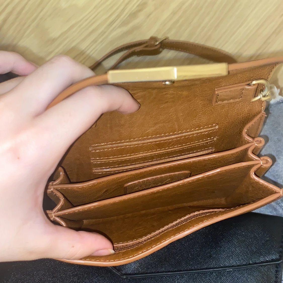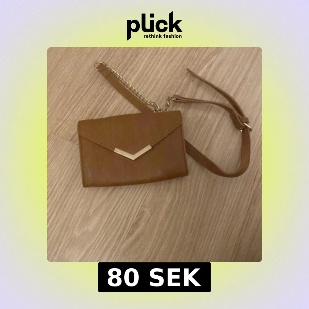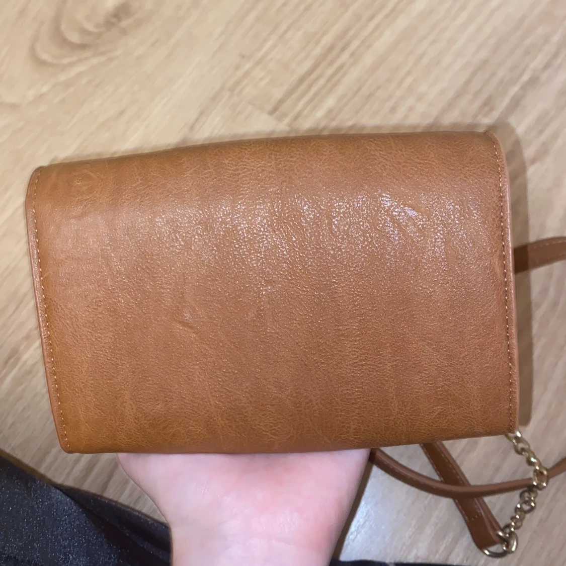Snygg brun kuvertväska med axelrem i skinnimitation och guldfärgad kedja. Väskan har ett stilrent V-format metallspänne framtill och flera fack inuti för kort och småsaker. Perfekt storlek för det viktigaste och enkel att matcha med olika outfits.
