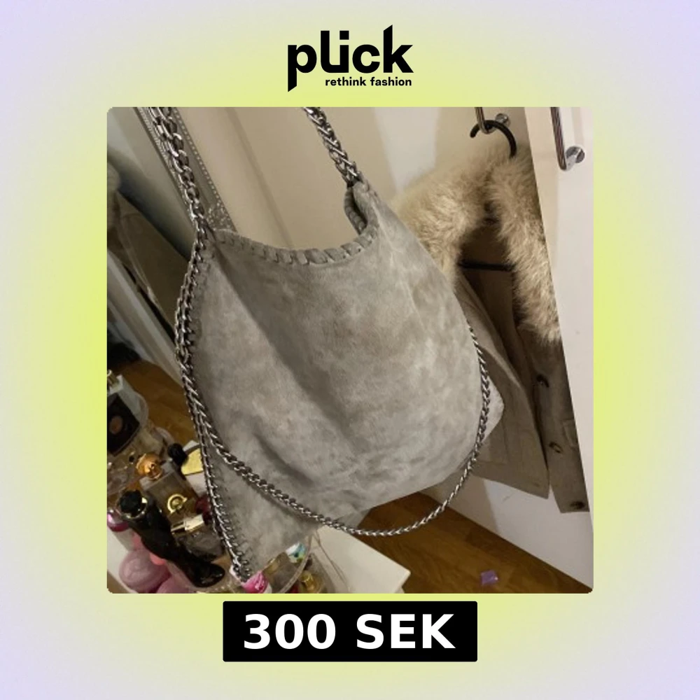 Snygg grå axelväska med kedjedetaljer längs kanterna och axelremmen. Väskan har en dragkedja på baksidan. Väldigt bra skick använd endast 2-3 gånger