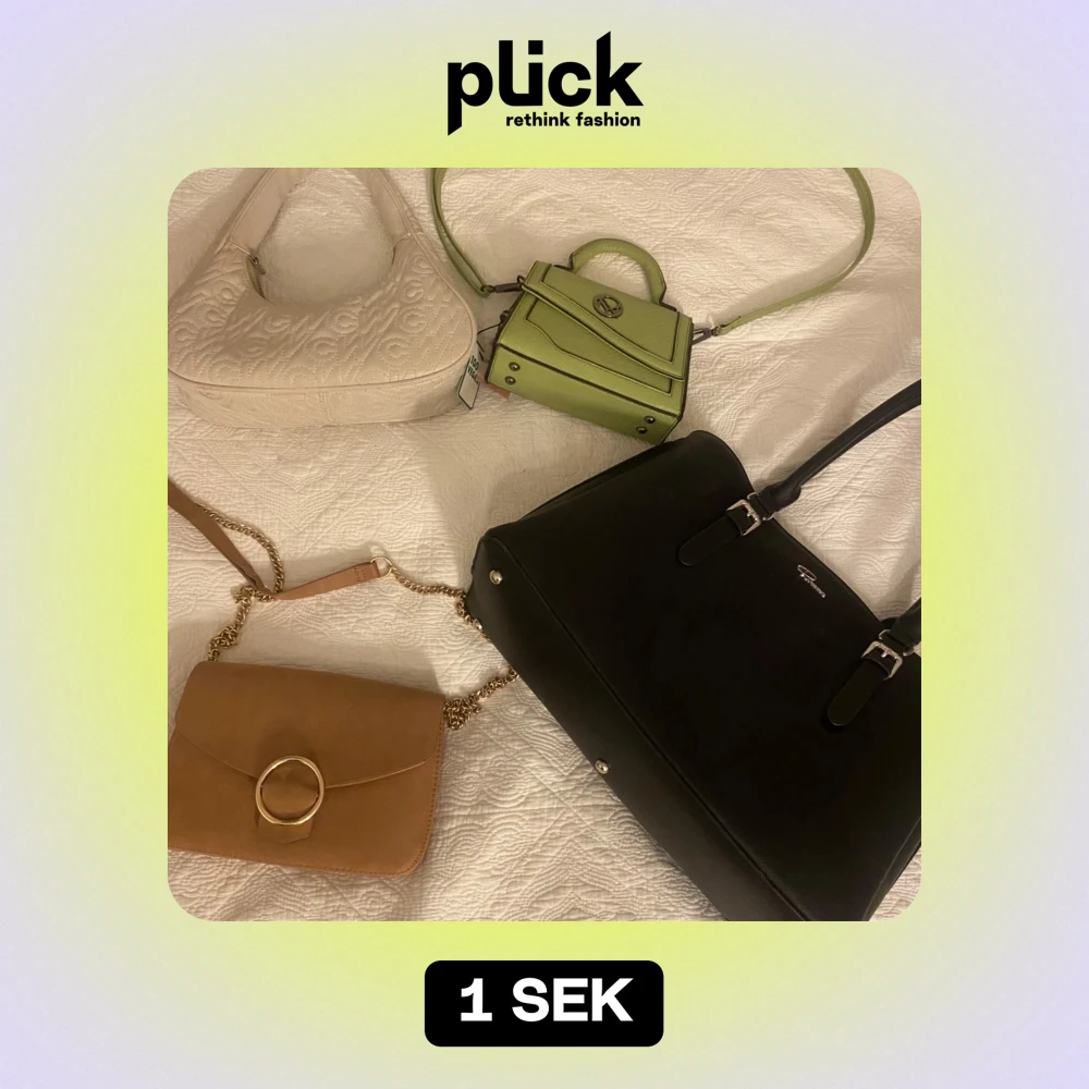 Säljer en samling av fyra snygga väskor i olika stilar och färger. En vit liten handväska 50kr, en grön handväska i syntet med unika detaljer (köpte på mode outlet så finns bara en av den aldrig använd) 200kr , en svart skinnväska med dragkedja (köpt på rizzo för 900kr) 400kr och en beige/rosa axelväska med guldkedja och spänne från h&m 40kr. Perfekta för olika tillfällen och outfits!