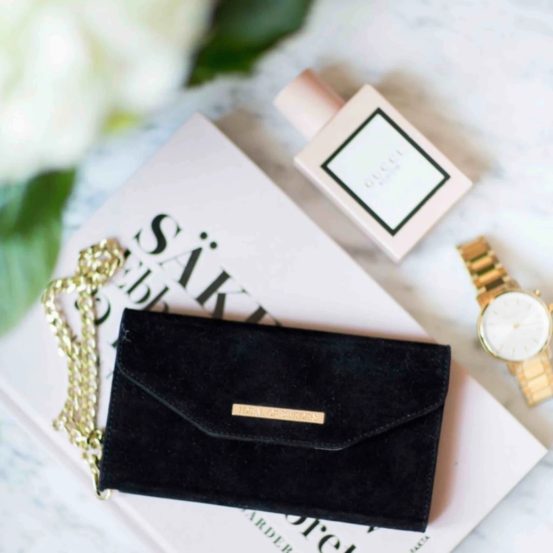 Mayfair Clutch Velvet (svart sammet) för iPhone XS. 3 kortfack + sedelficka. Guldfärgad handledskedja. Svart mobilskal medföljer, alla iDeal of Sweden’s ”Fashion cases” är magnetiskt kompatibla med denna! HELT NY!