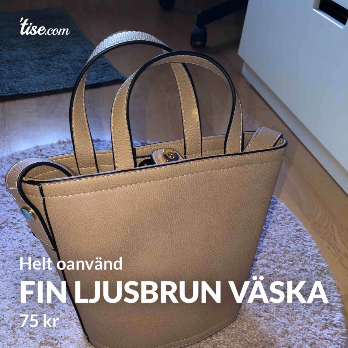 En fin brun väska som är oanvänd och helt ny! Den är rund i botten, har ett stort fack och sedan två små inuti! Stängs med en knapp längst upp, har både handtag och axelrems band!