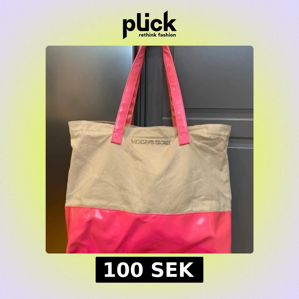 Stor shoppingväska från Victoria's Secret i beige canvas med glansig rosa botten och matchande rosa handtag. Väskan har ett rymligt fack och logga i silver framtill. Perfekt för att bära med sig allt man behöver till skolan eller stan. 38 cm bred 33 cm hög 17 cm djup