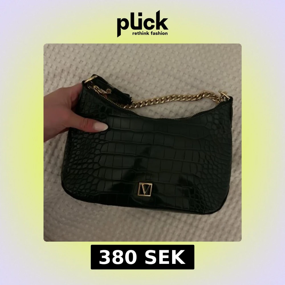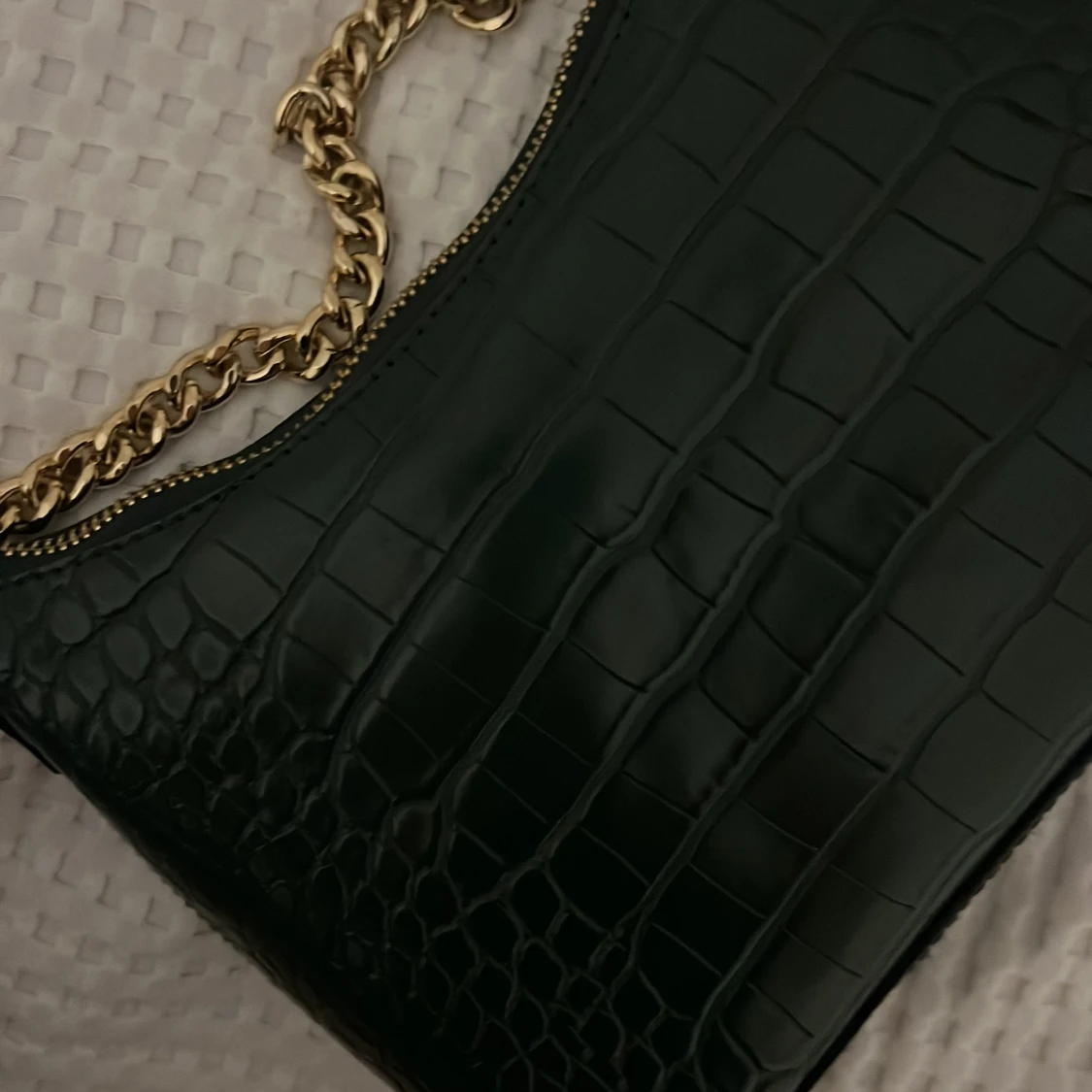 Snygg grön axelväska från Victoria Secret med krokopräglat mönster och guldfärgad kedja som axelrem. Väskan har en dragkedja upptill och en elegant guldfärgad logga framtill. Perfekt för dig som vill sticka ut med en trendig accessoar.