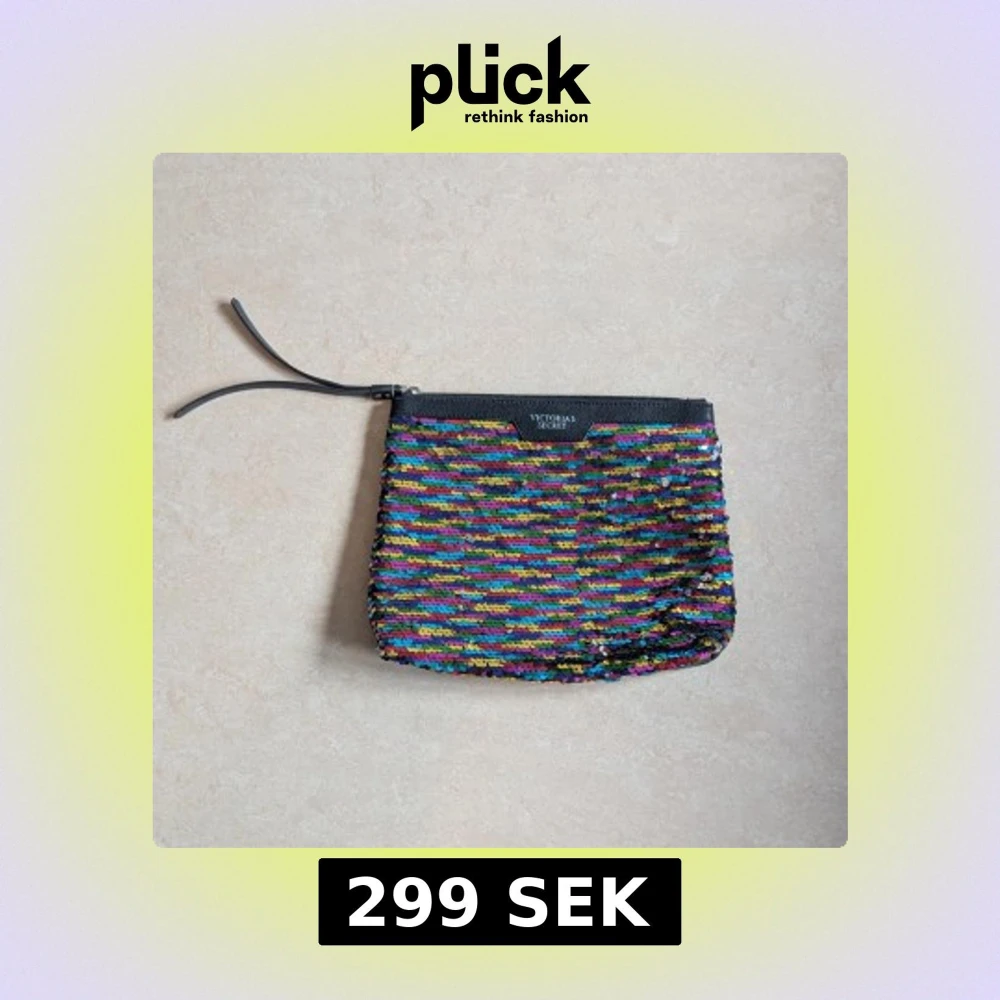 Färgstark kuvertväska från Victoria's Secret med glittriga paljetter i regnbågens färger på framsidan och svart konstläder på baksidan. Väskan har dragkedja.. Perfekt för dig som vill sticka ut med din stil.