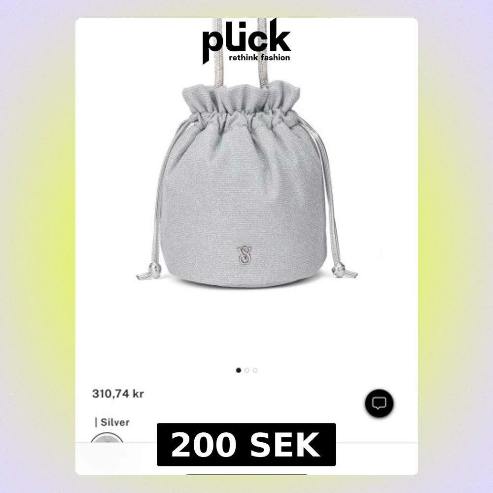 Glittrig silverfärgad handväska från Victoria's Secret i bucket-modell med dragsko och gnistrande handtag. Väskan har VS-logga framtill och skimrande tyg som ger en lyxig känsla. Perfekt för dig som vill sticka ut med en snygg accessoar.