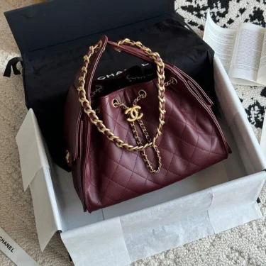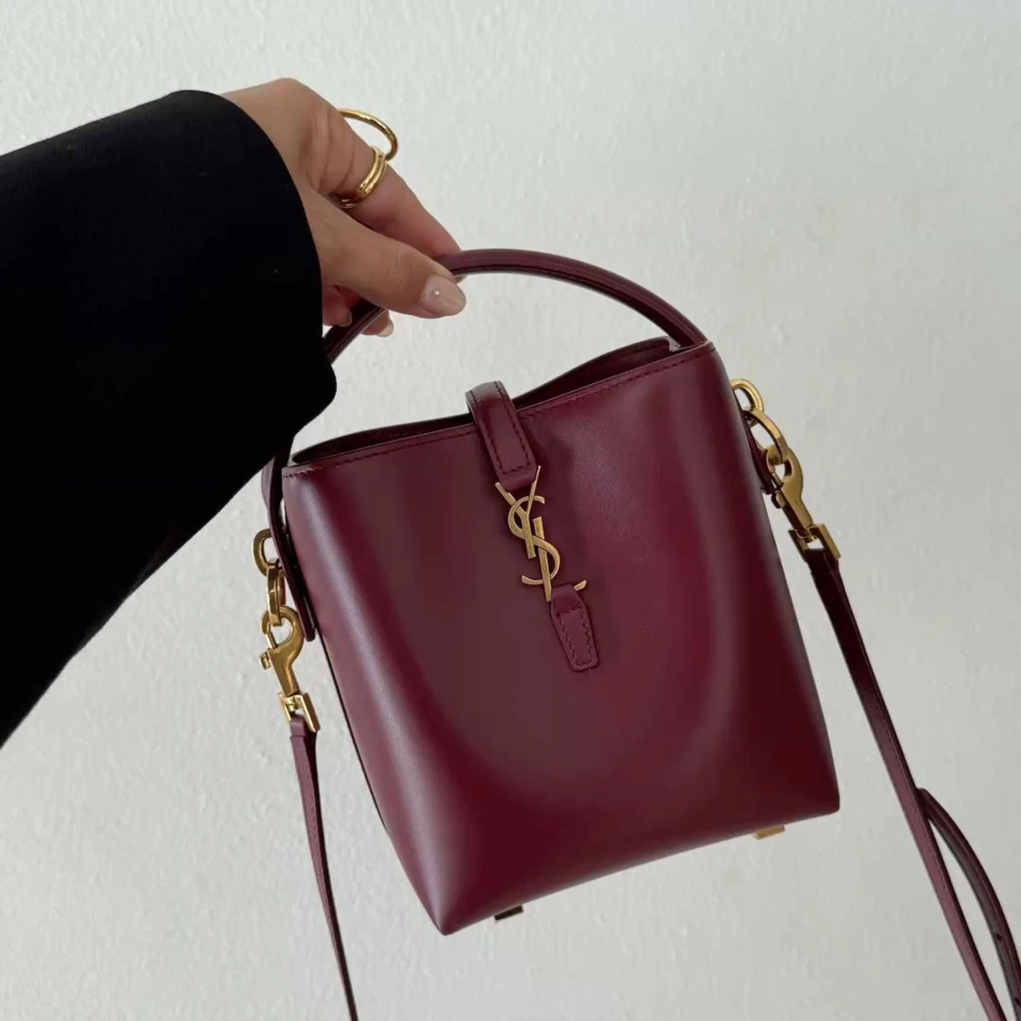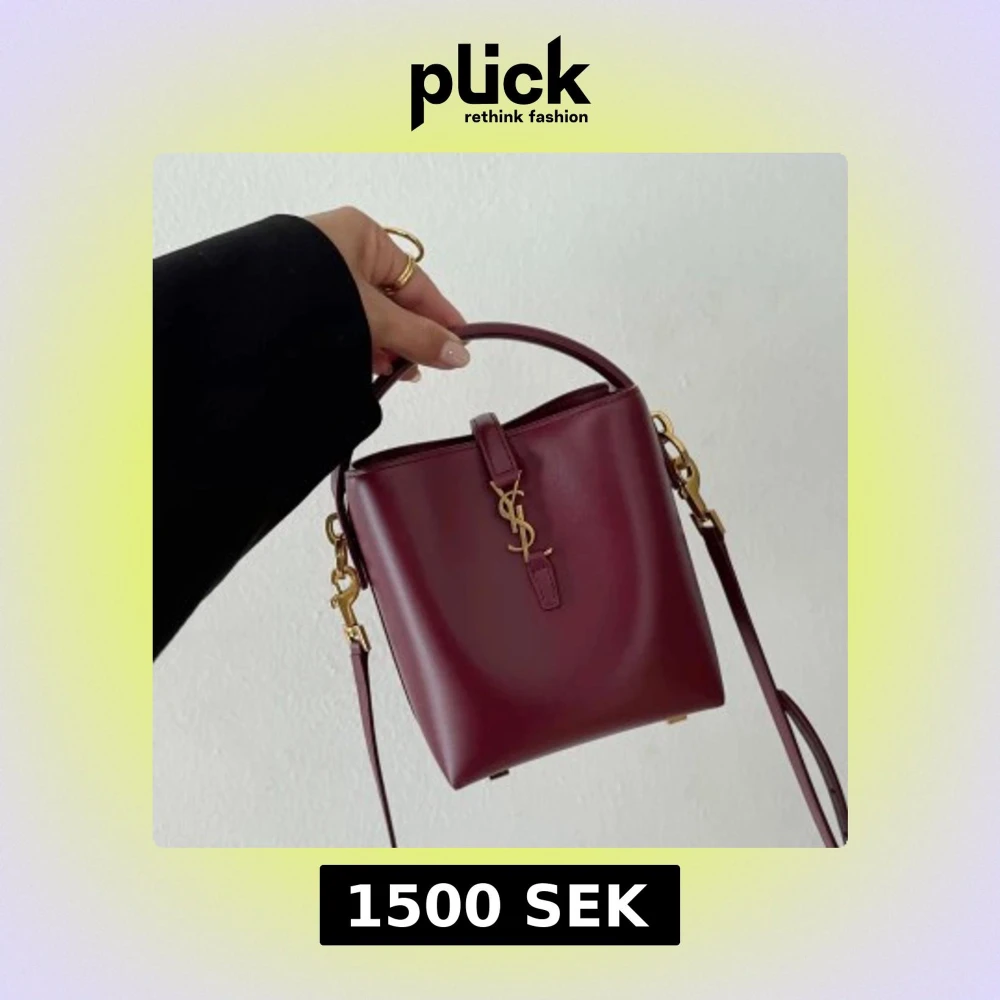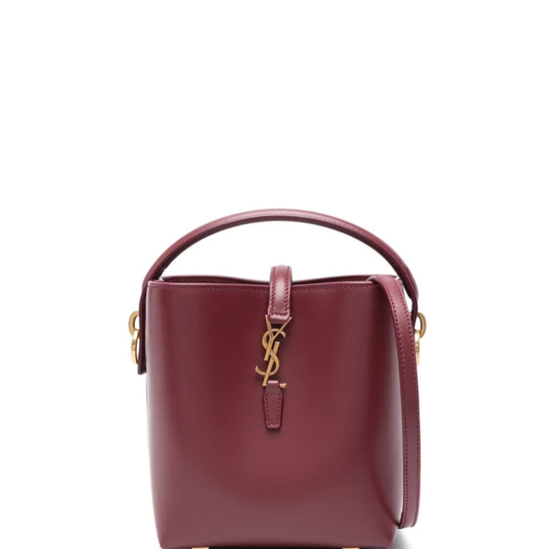 Snygg vinröd axelväska från Saint Laurent i slätt skinn med guldiga metalldetaljer och ikoniskt YSL-emblem framtill. Väskan har både handtag och justerbar axelrem, perfekt för en trendig look. Stilren bucket-modell som rymmer det viktigaste.