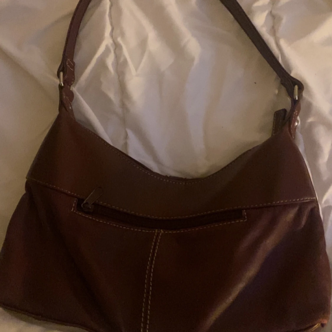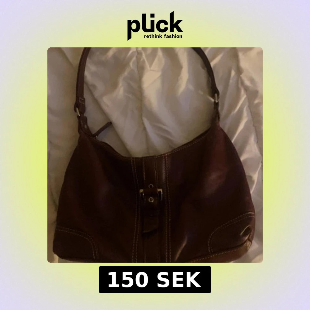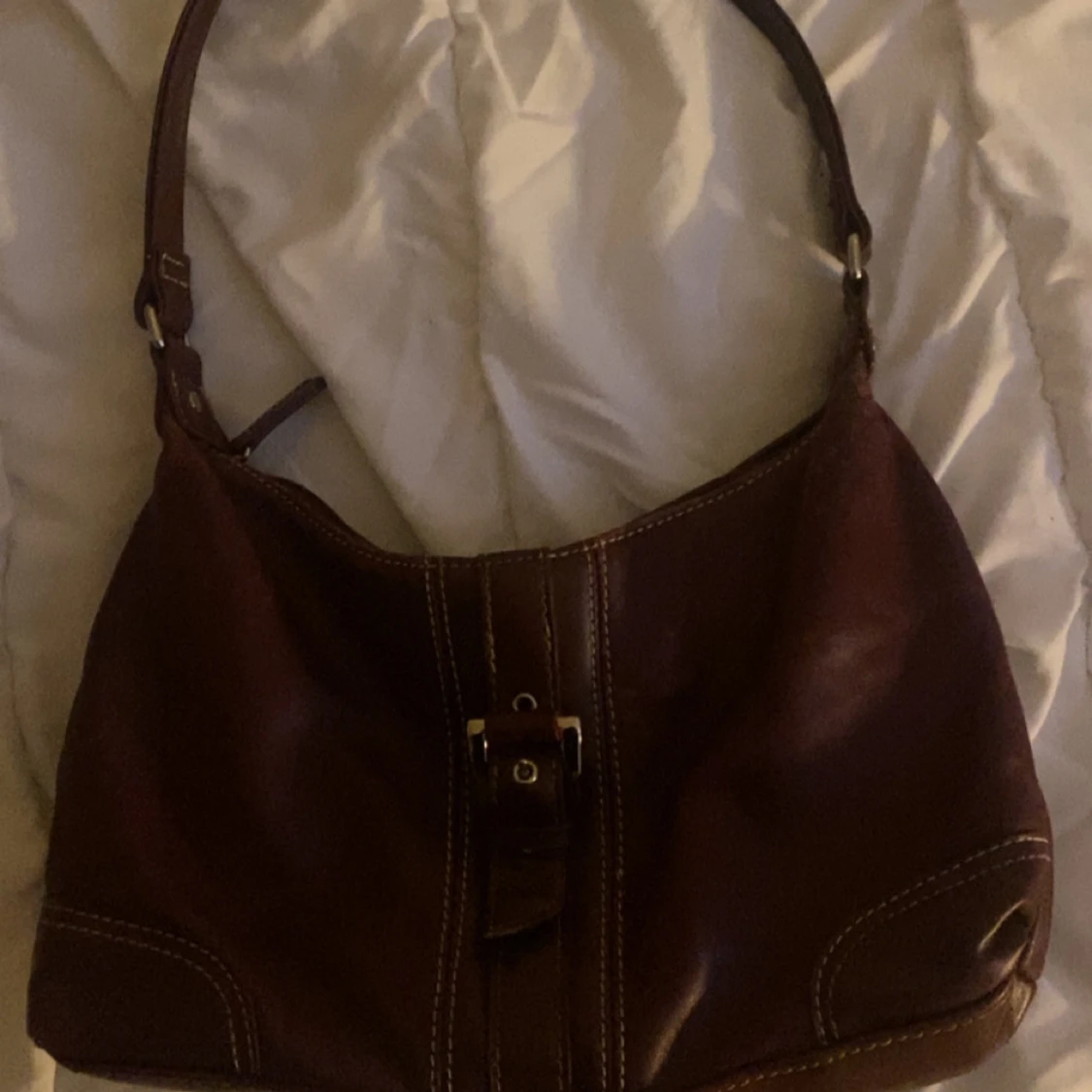 Säljer en stilren vinröd axelväska i skinn med dekorativa sömmar och spänndetalj framtill. Väskan har ett huvudfack och en mindre ficka med dragkedja på baksidan. Perfekt för dig som vill ha en klassisk accessoar.