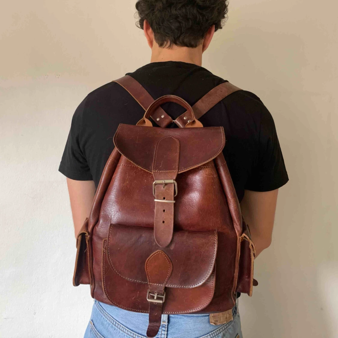 Vintage italiensk ryggsäck i äkta läder i perfekt skick. 39 cm hög. Finns i Stadshagen. Kan mötas upp i Sthlm eller skickas mot fraktkostnad.