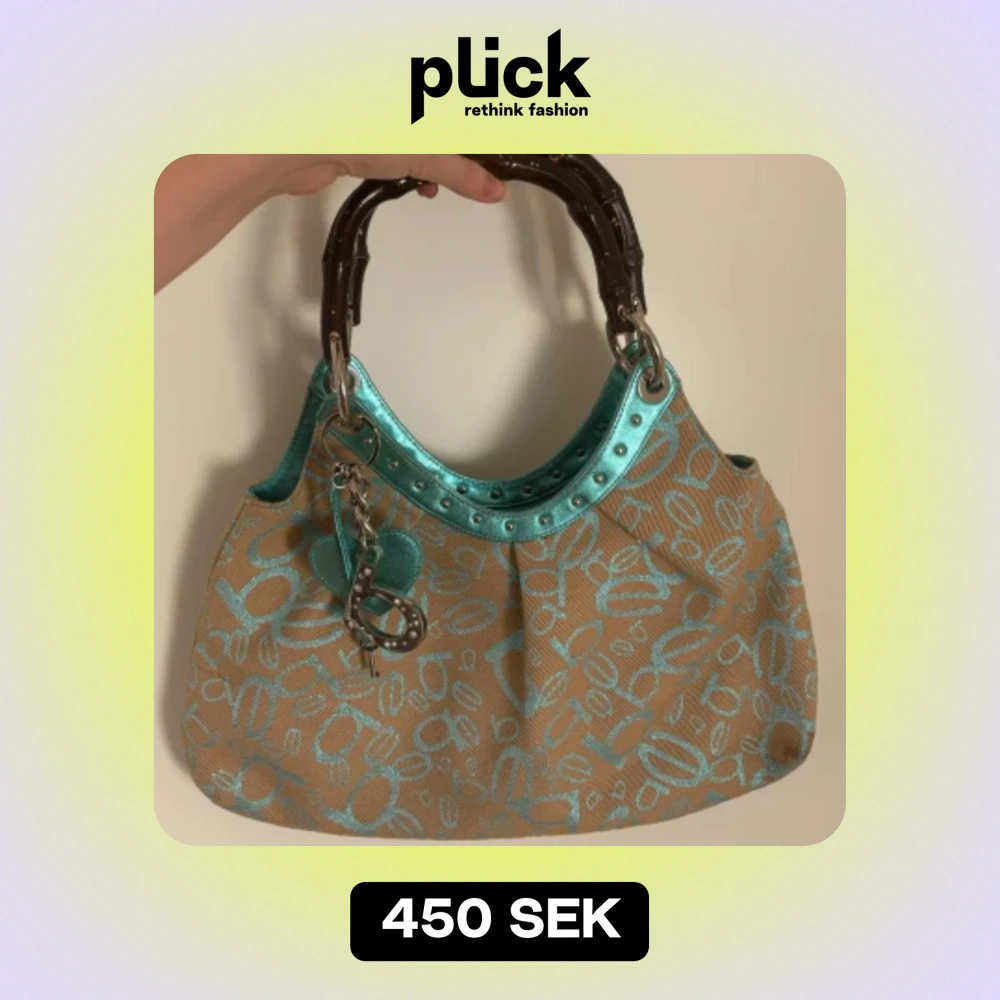 Bebe vÀska med original trÀhandtag och nyckelring kvar, har nÄgra missfÀrgningar men gÄr nog att tvÀtta bort. Matchande plÄnbok följer med.