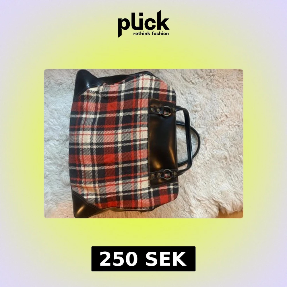 Rutig vintage handväska med svarta skinnhandtag