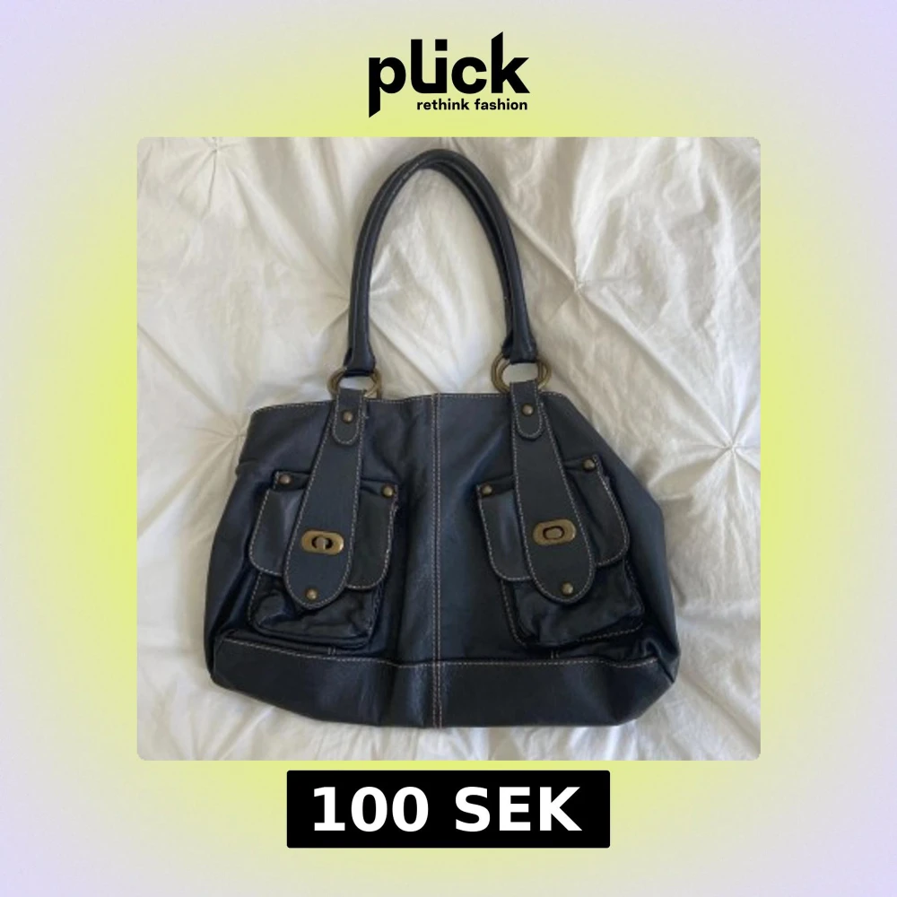 Snygg svart handväska i skinn (vet ej om äkta) med två stora ytterfickor framtill, dekorativa mässingsfärgade spännen och kontrastsömmar. Väskan har dubbla handtag och coola ringdetaljer i metall. Får plats med dator. Köpt på Vinted.