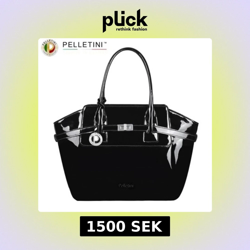 Vintage svart handväska från Pelletini i glansigt lackat skinn. Väskan är från ett tyskt märke- Pelletini och kom ut 1988 och säljs ej längre. Ej använd men har någon repa på samt skav på handtagen men det syns ej om man inte tittar noga på nära håll. I storlek så är den som en vanlig handväska alltså medium ungefär. Pris kan diskuteras. Skriv för mer bilder