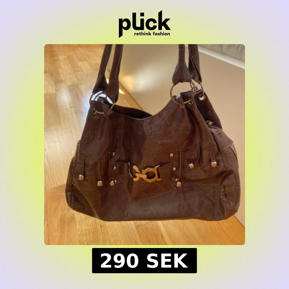 En snygg väska som ger lite vintage// y2k känsla. Den har tre stora fack var av facket i mitten har små fack inuti. Den har ett litet fack utanpå på baksidan av väskan. Den är stor och rymlig och den har inga stora defekter förutom att det är lite röd färg på den (se sista bilderna). Vet inte om färgen går att få bort med något medel eftersom jag inte har försökt att få bort det.