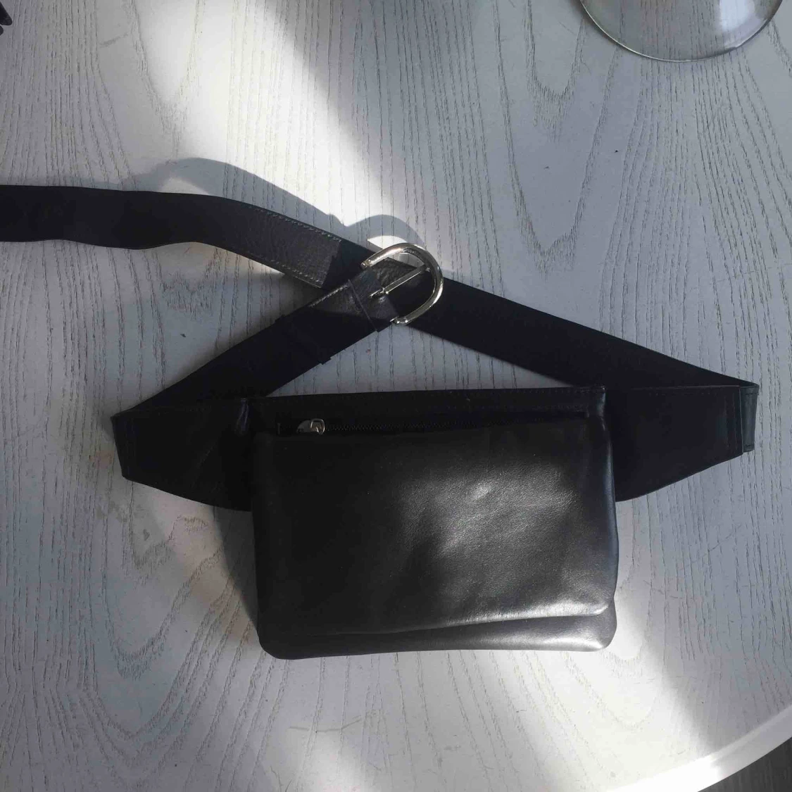 Svart skinnväska som är lite mindre men med bra utrymme och kan användas som plånbok. Oerhört bra skick, syns inget slit och kan användas runt midjan samt som magväska som hänger över magen.