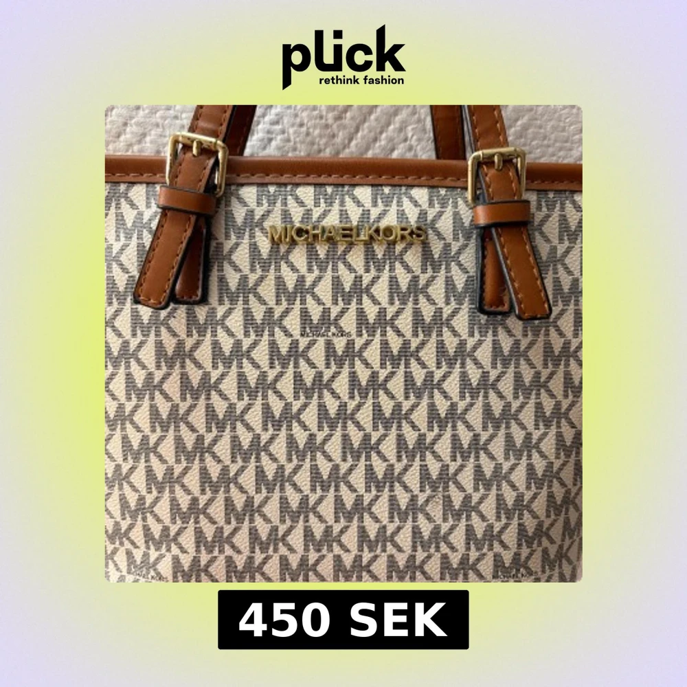 Snygg handväska från Michael Kors i beige och grått med MK-logga över hela väskan. Väskan har bruna handtag med guldfärgade spännen och detaljer. Medföljande axelband💞