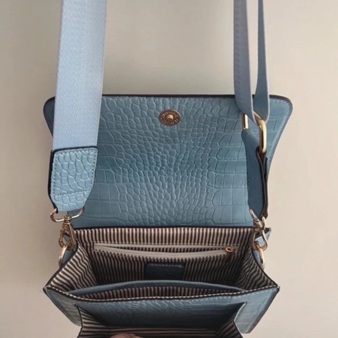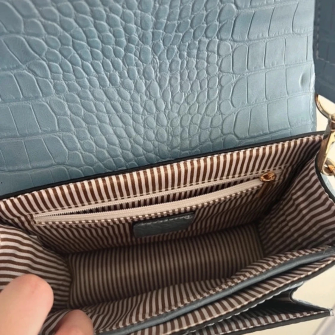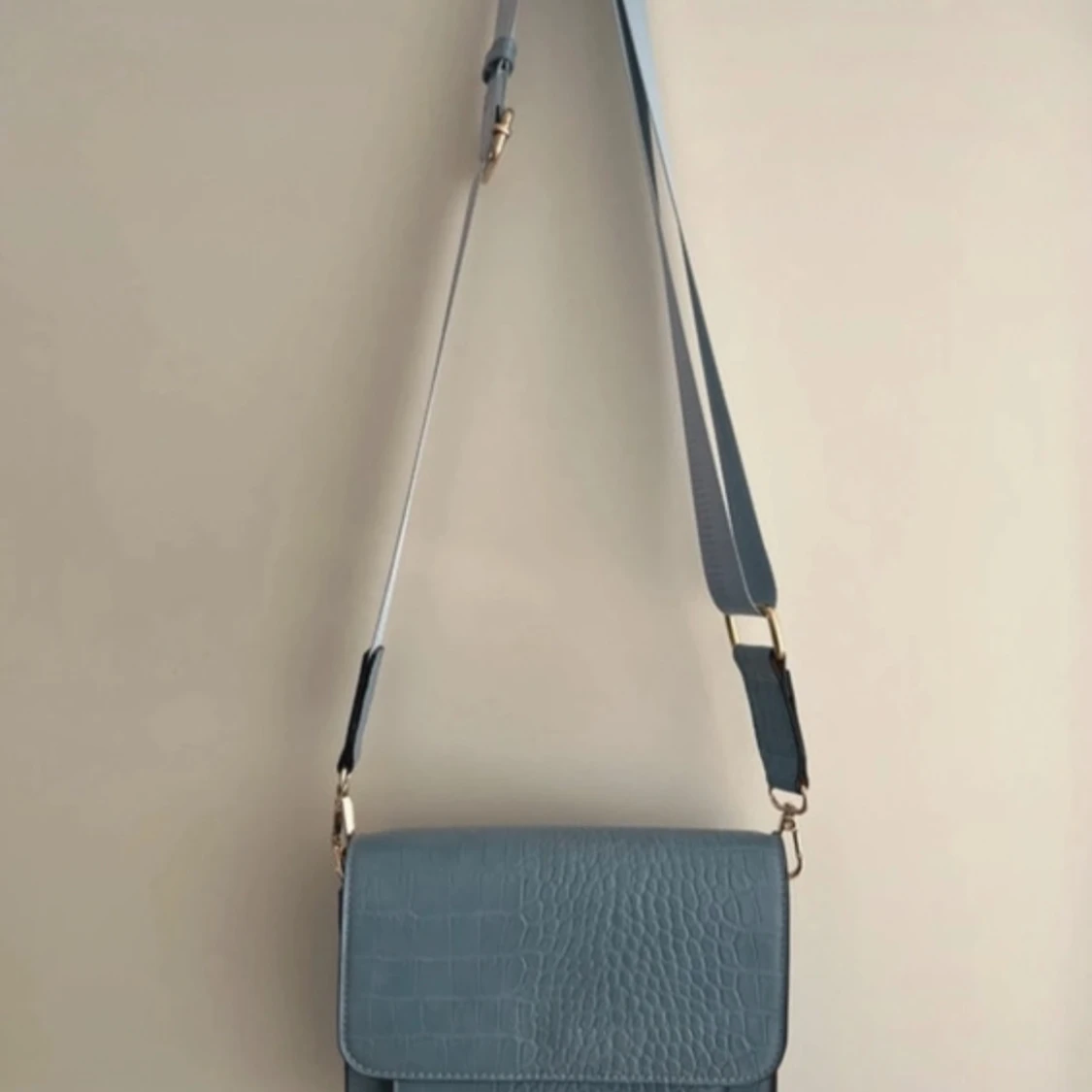 Snygg ljusblå axelväska med mönster och bred justerbar axelrem. Väskan har guldfärgade detaljer och ett randigt innerfoder med dragkedjefack. Perfekt storlek för mobil, plånbok och småsaker.
