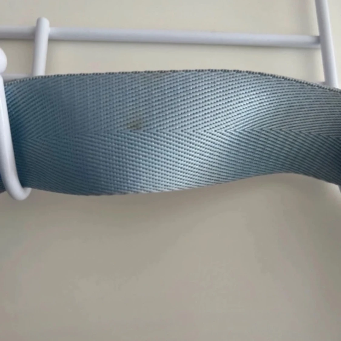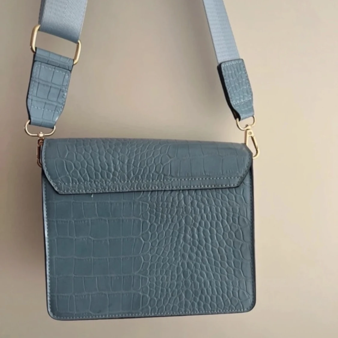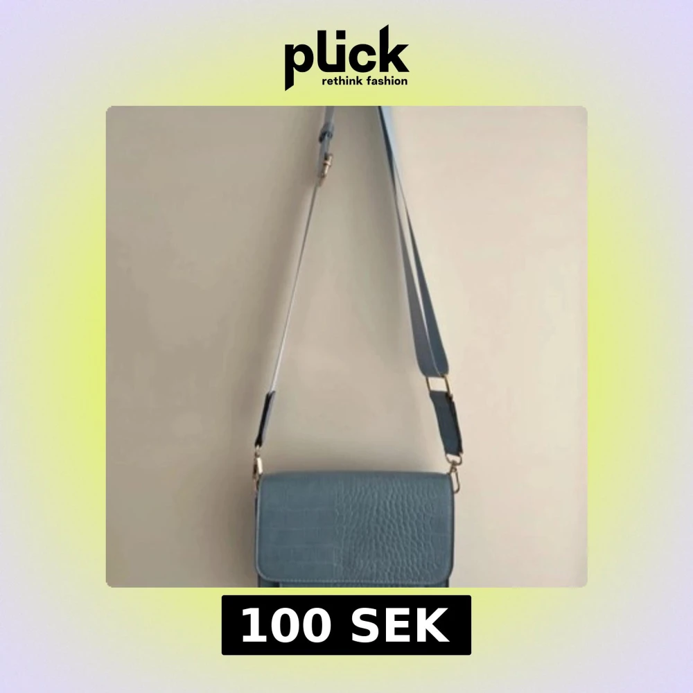 Snygg ljusblå axelväska med mönster och bred justerbar axelrem. Väskan har guldfärgade detaljer och ett randigt innerfoder med dragkedjefack. Perfekt storlek för mobil, plånbok och småsaker.