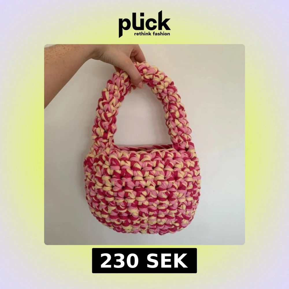 Superfin chunky handväska i virkad bomull med ett brett handtag. Väskan är handgjord i rosa, ljusgul och ljusrosa toner som ger en färgglad och unik look. Perfekt för dig som vill ha en unik accessoar