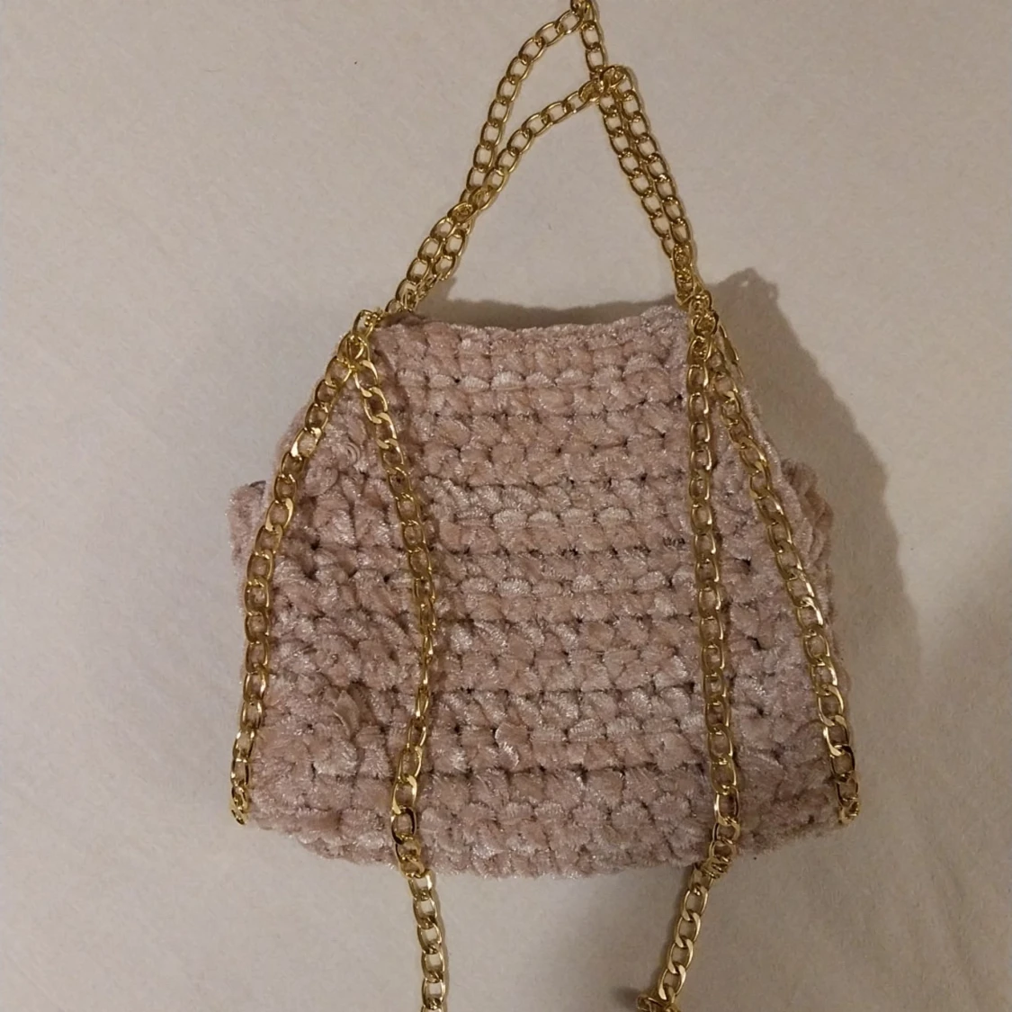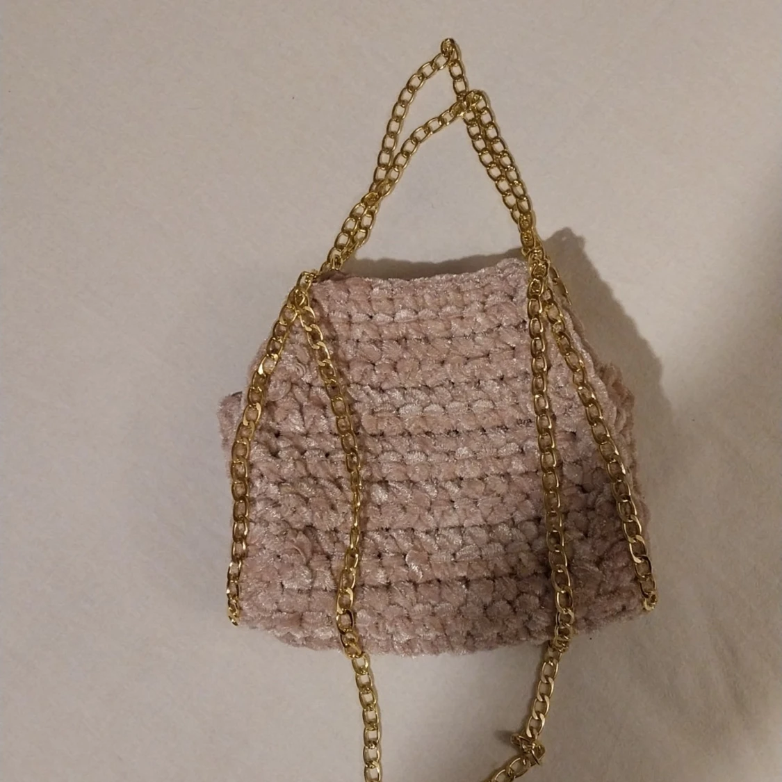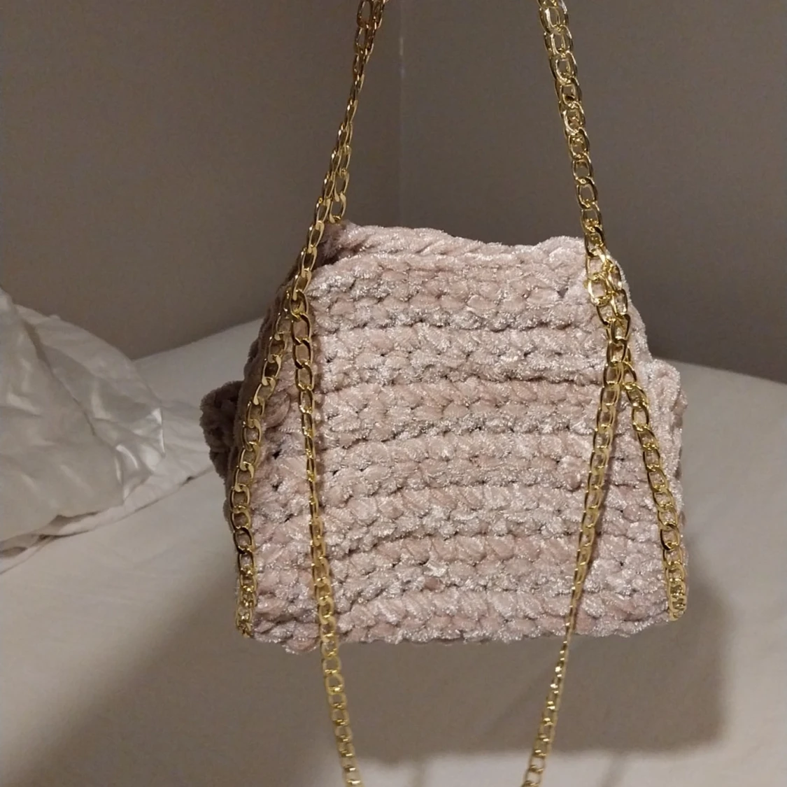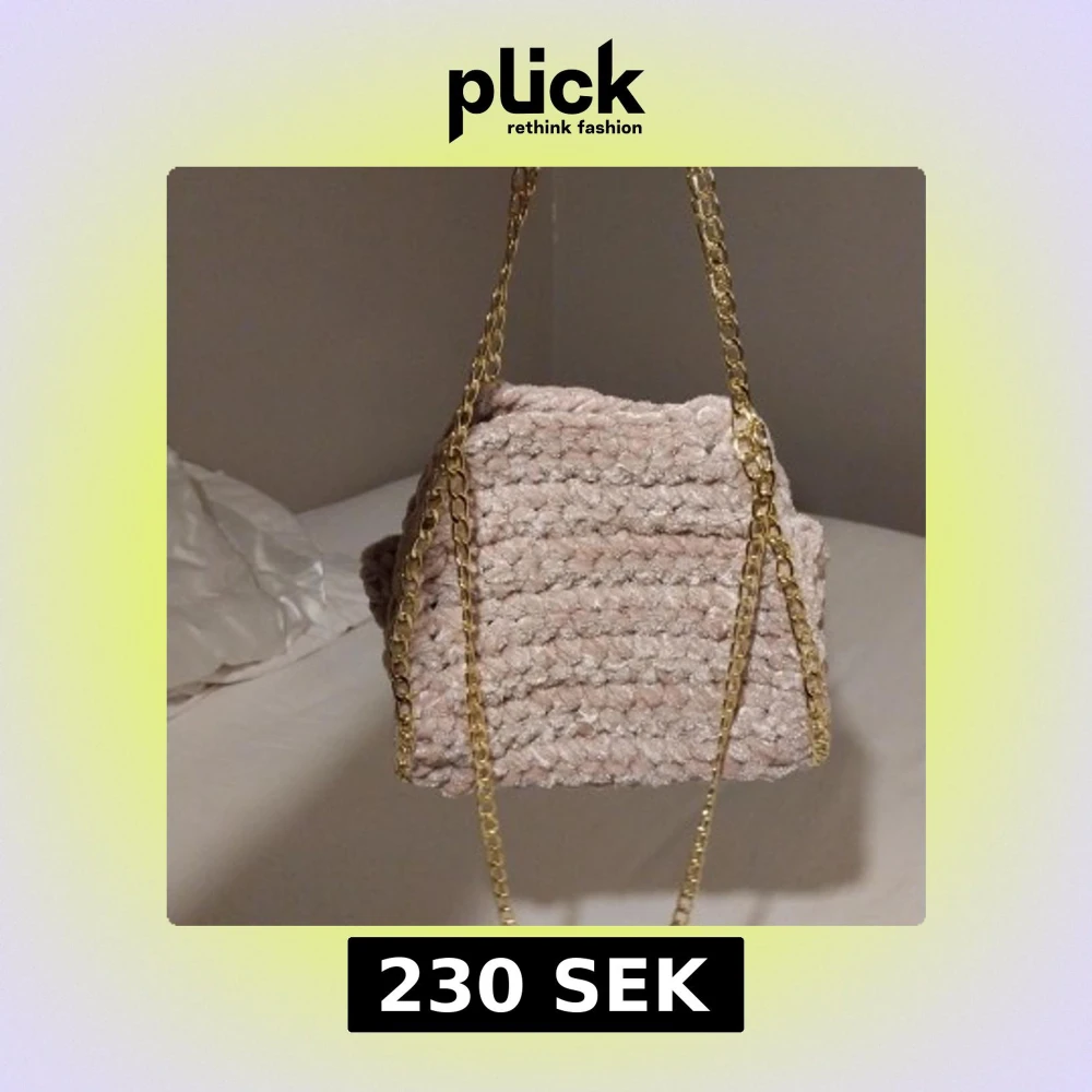 Säljer en snygg rosa virkad väska med en elegant guldkedja. Väskan har en unik textur och är perfekt för att ge din outfit en stilfull touch. Passar utmärkt som accessoar för olika tillfällen.