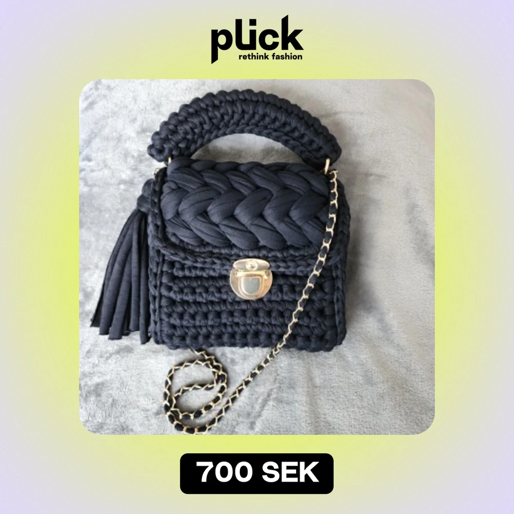 Handvirkad väska av zpagetti garn i svart färg (har gjort den själv). Är rymlig samt tjusig. Passar till det mesta. Om du vill ha i en annan färg eller storlek, tveka inte att skicka ett meddelande. Produkten är i djur och rökfritt miljö.