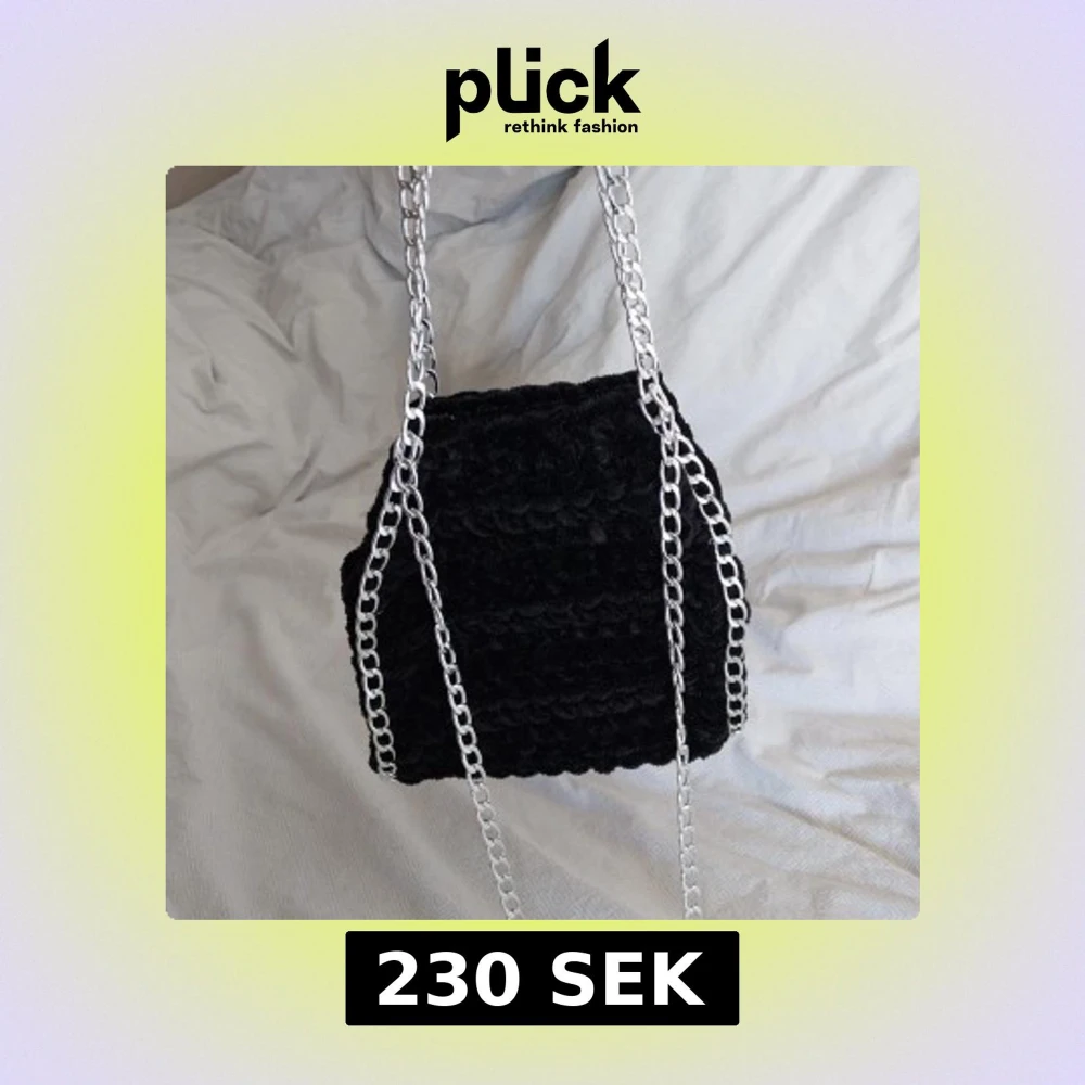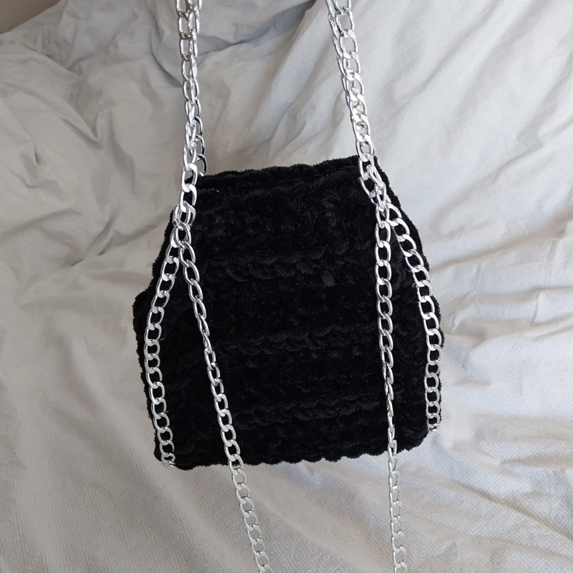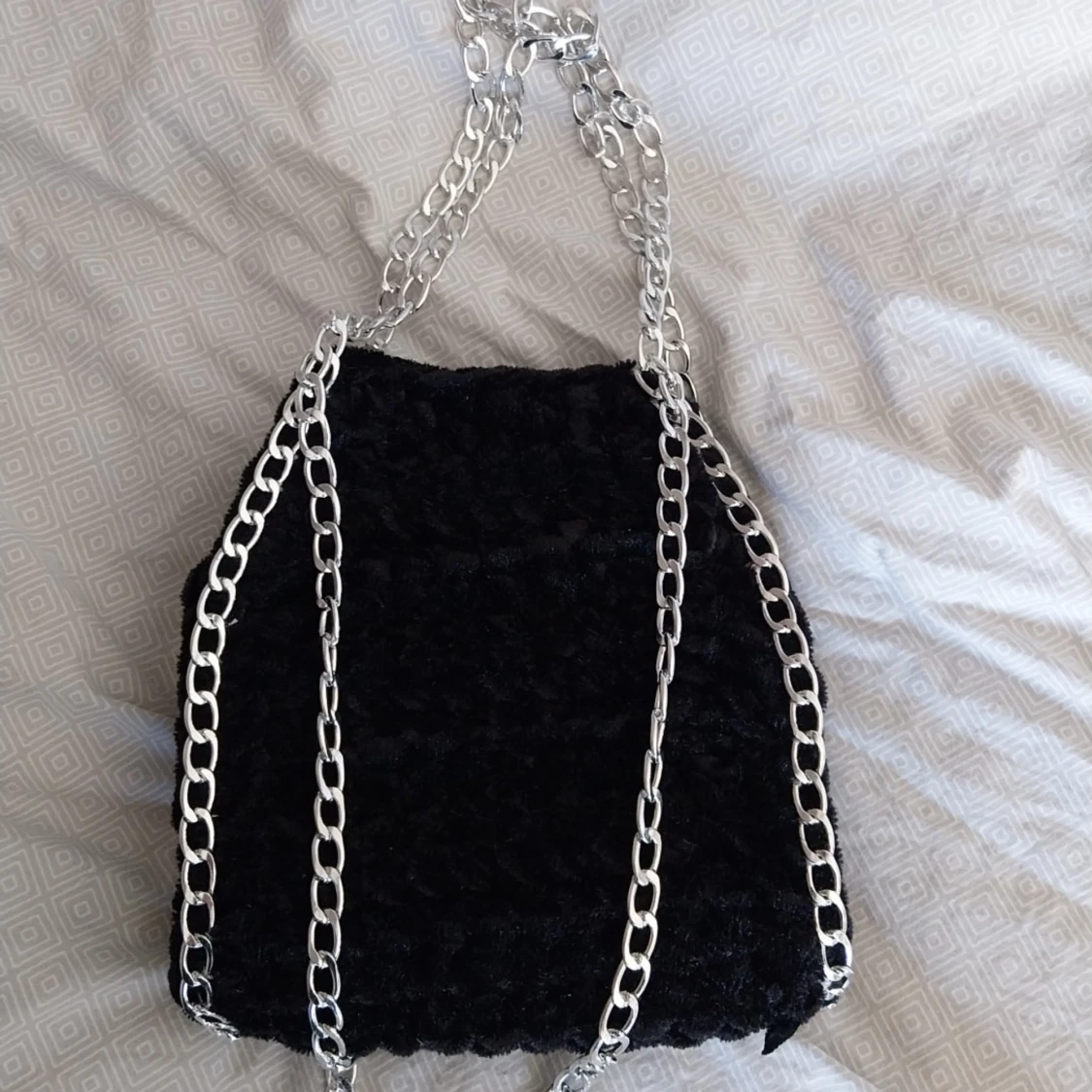Snygg svart virkad väska med silverfärgade kedjor. Perfekt för att ge din outfit en edgy touch. Väskan har en unik textur och är både stilren och praktisk.