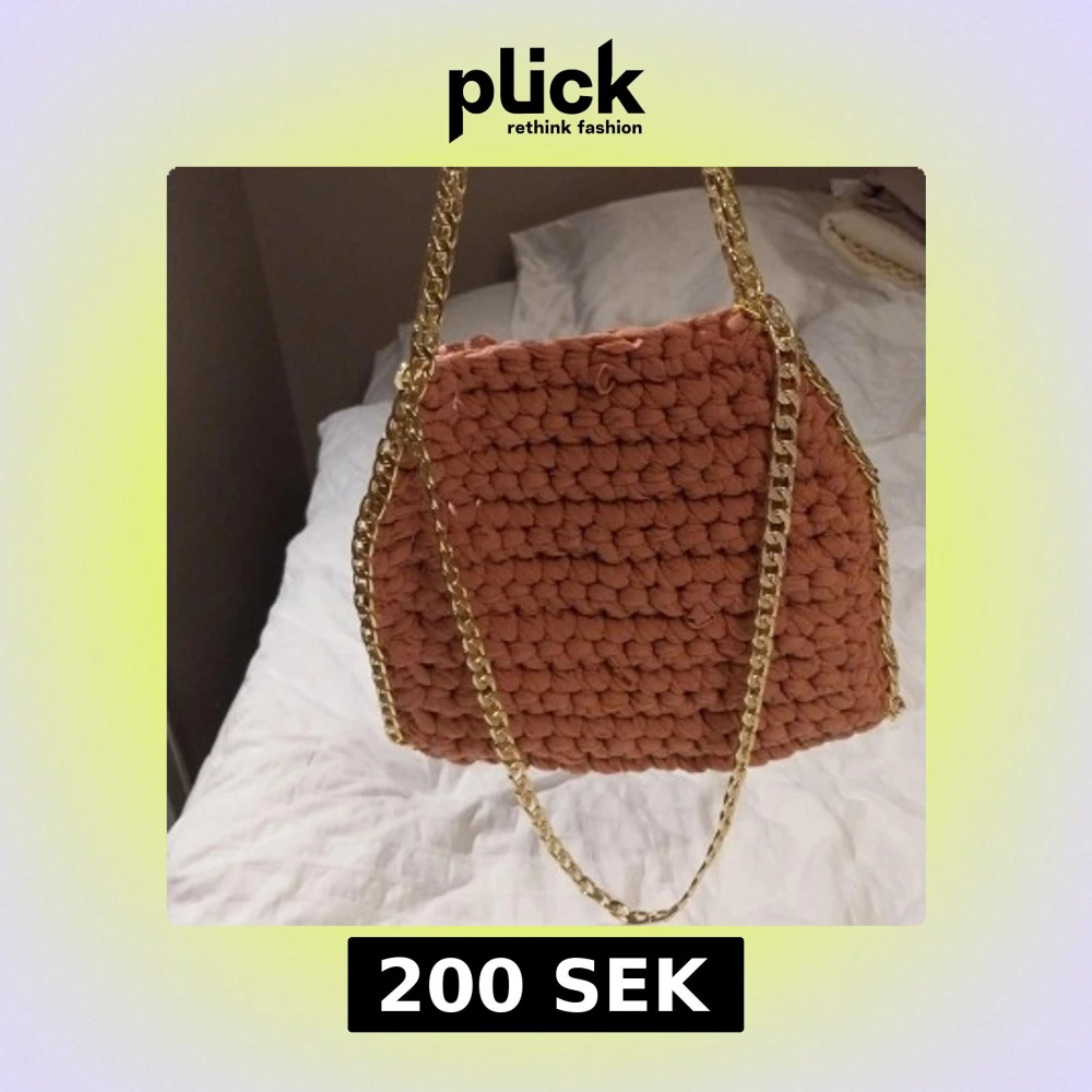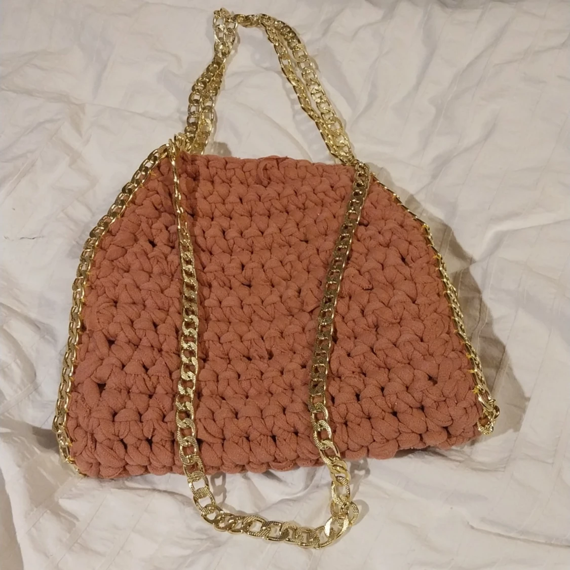 Trendig virkad väska i en varm rosa nyans med en elegant guldkedja. Perfekt för att ge din outfit en unik touch.