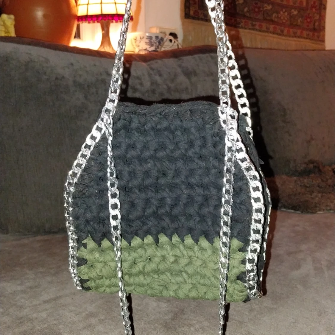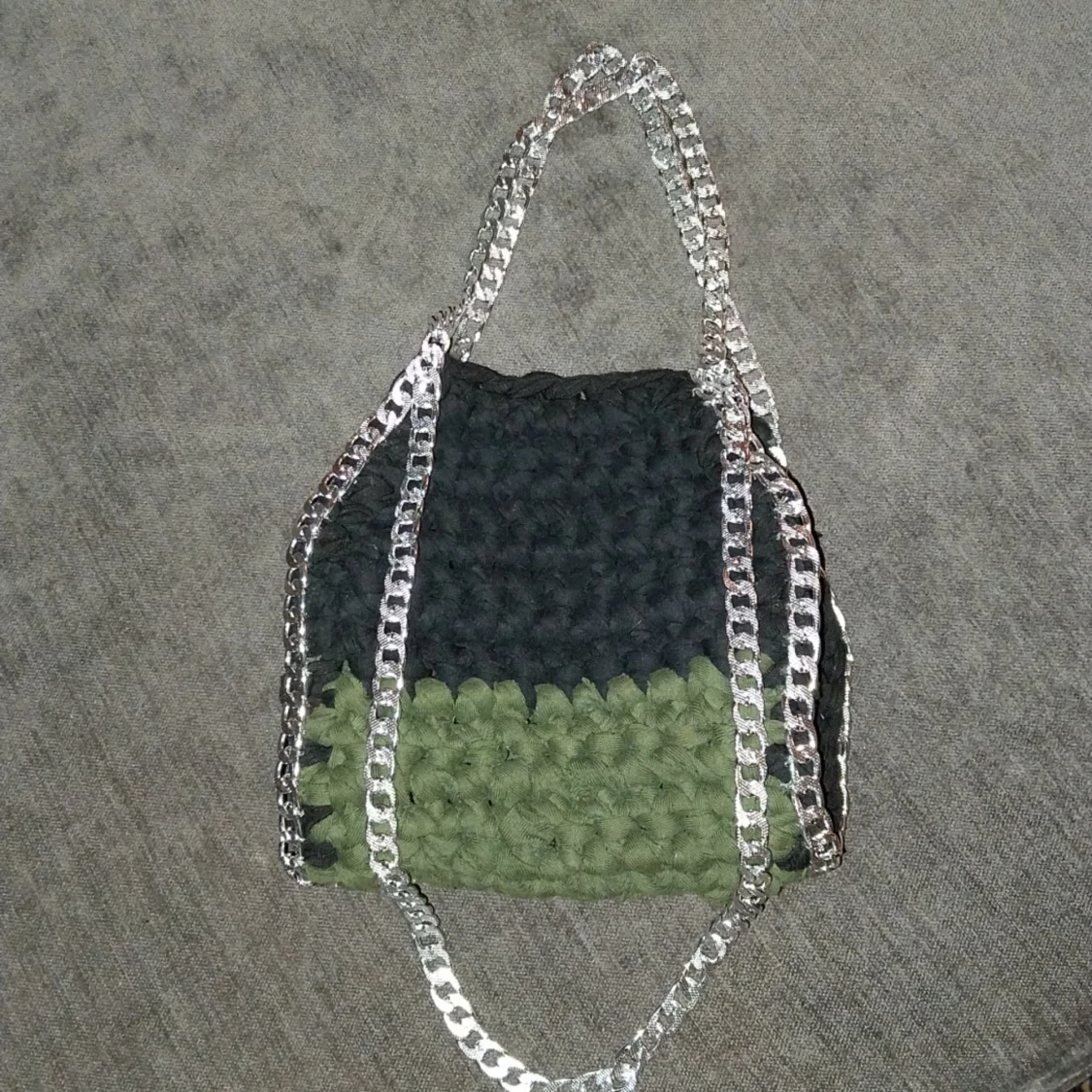 Unik virkad väska i svart och grön med silverfärgade kedjedetaljer. Perfekt för att ge din outfit en cool touch. Väskan har en rymlig design.