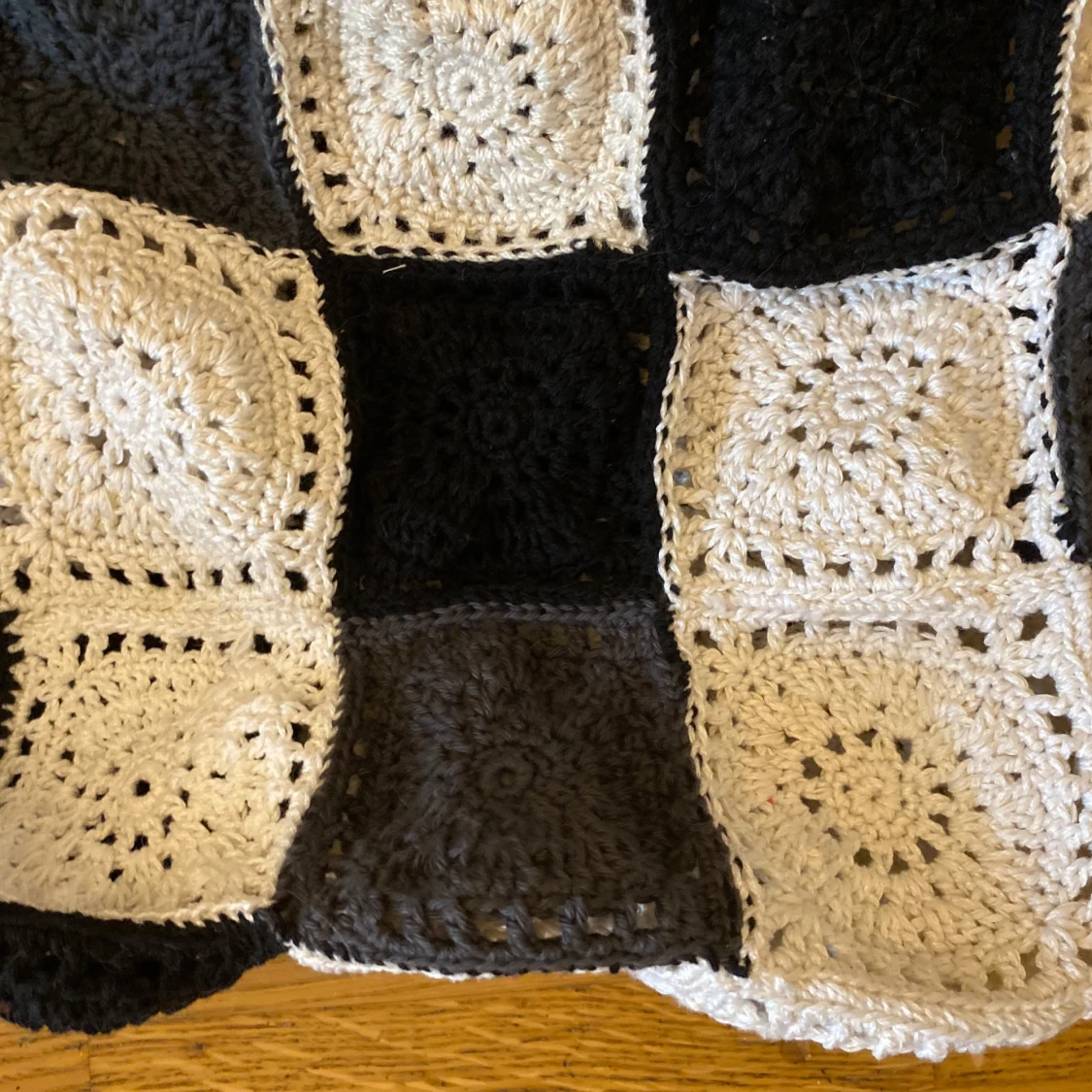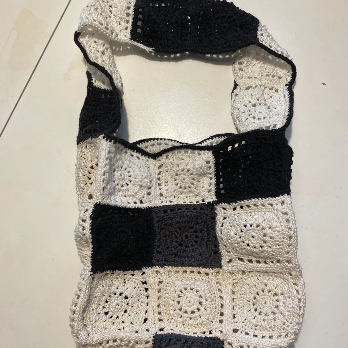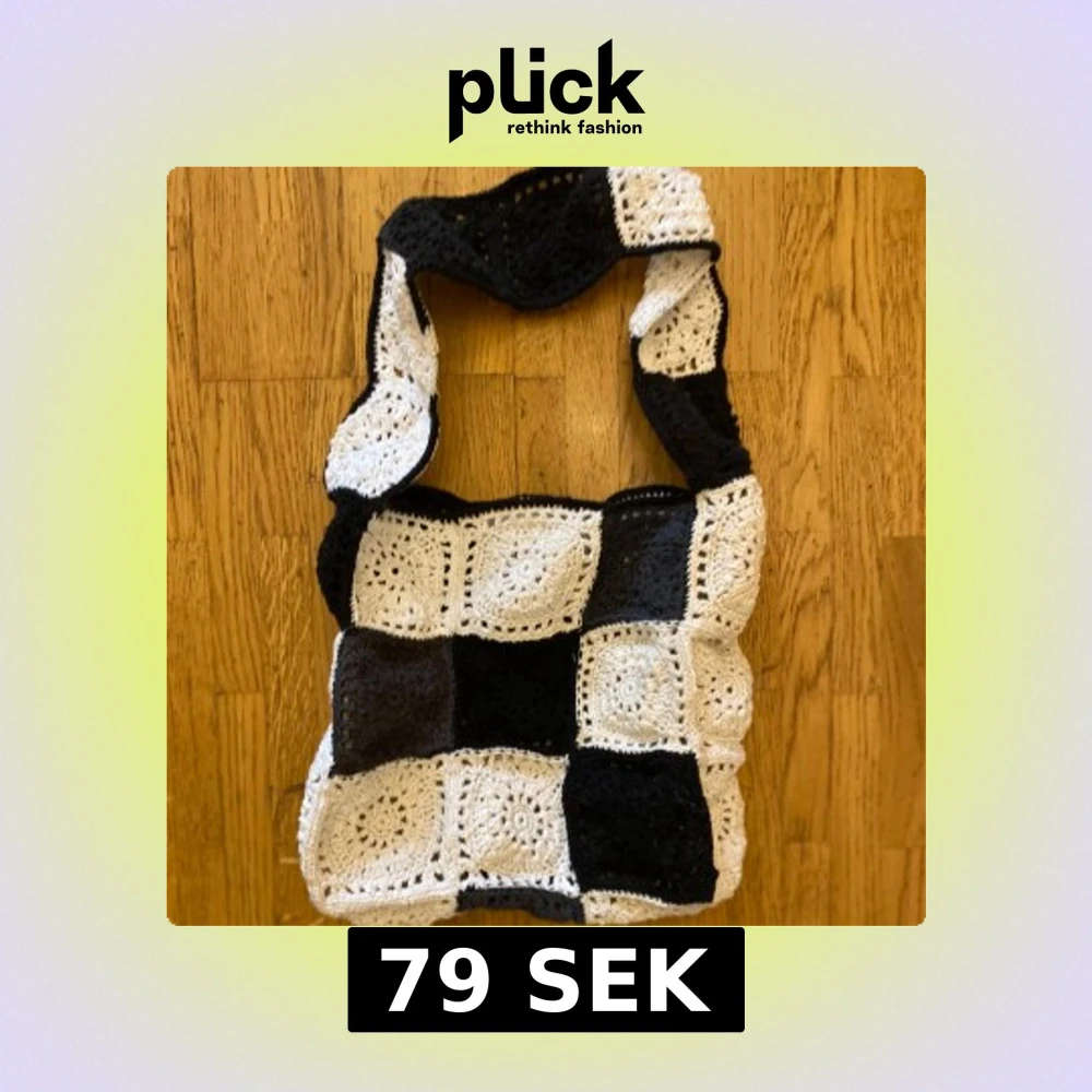 Helt ny virkad väska i ett schackrutigt mönster med svart/grå/ naturvit och vit färg. Väskan har ett virkat handtag i samma mönster. Mått: 25x25 x9 cm Axelrem: 65x9 cm Inga bilder när den sitter på mig! Katter finns i hemmet!