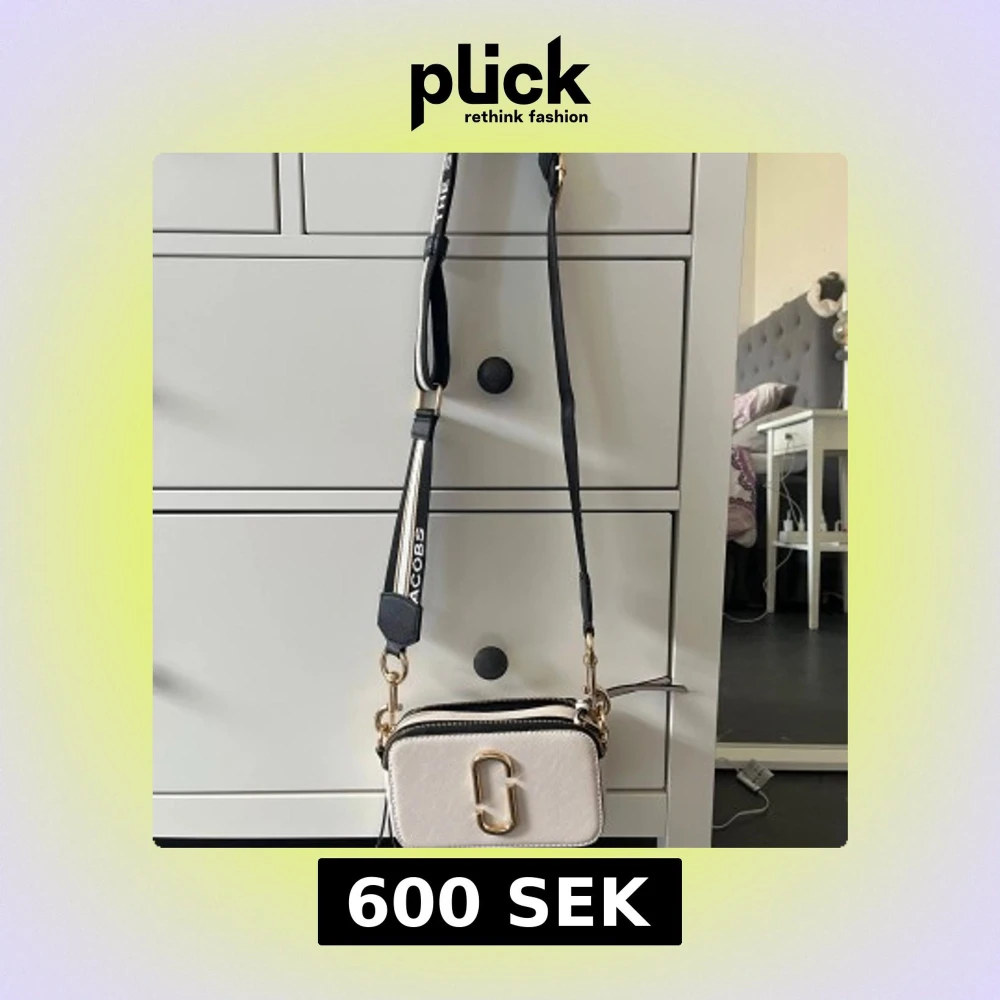 Säljer en snygg vit axelväska från Marc Jacobs med bred svart axelrem och guldiga metalldetaljer. Väskan har ett stort logospänne framtill och dragkedja upptill. Perfekt storlek för det viktigaste och cool design med kontrastdetaljer. Väskan är i den minsta storleken.