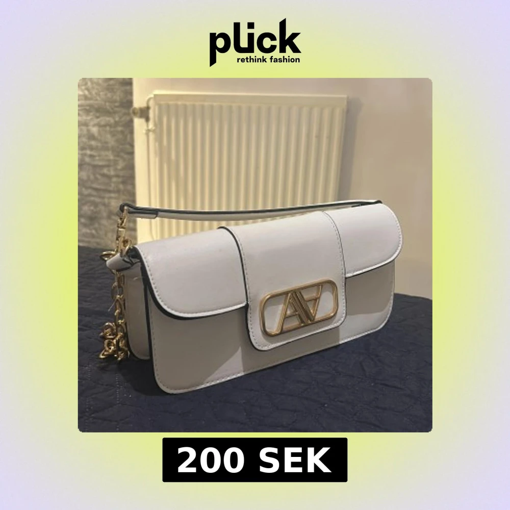 Snygg vit axelväska med elegant guldkedja och stilren design. Väskan har ett dekorativt guldfärgat spänne på framsidan och en praktisk axelrem. Perfekt för att ge din outfit en lyxig touch.