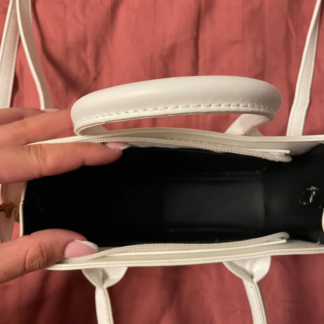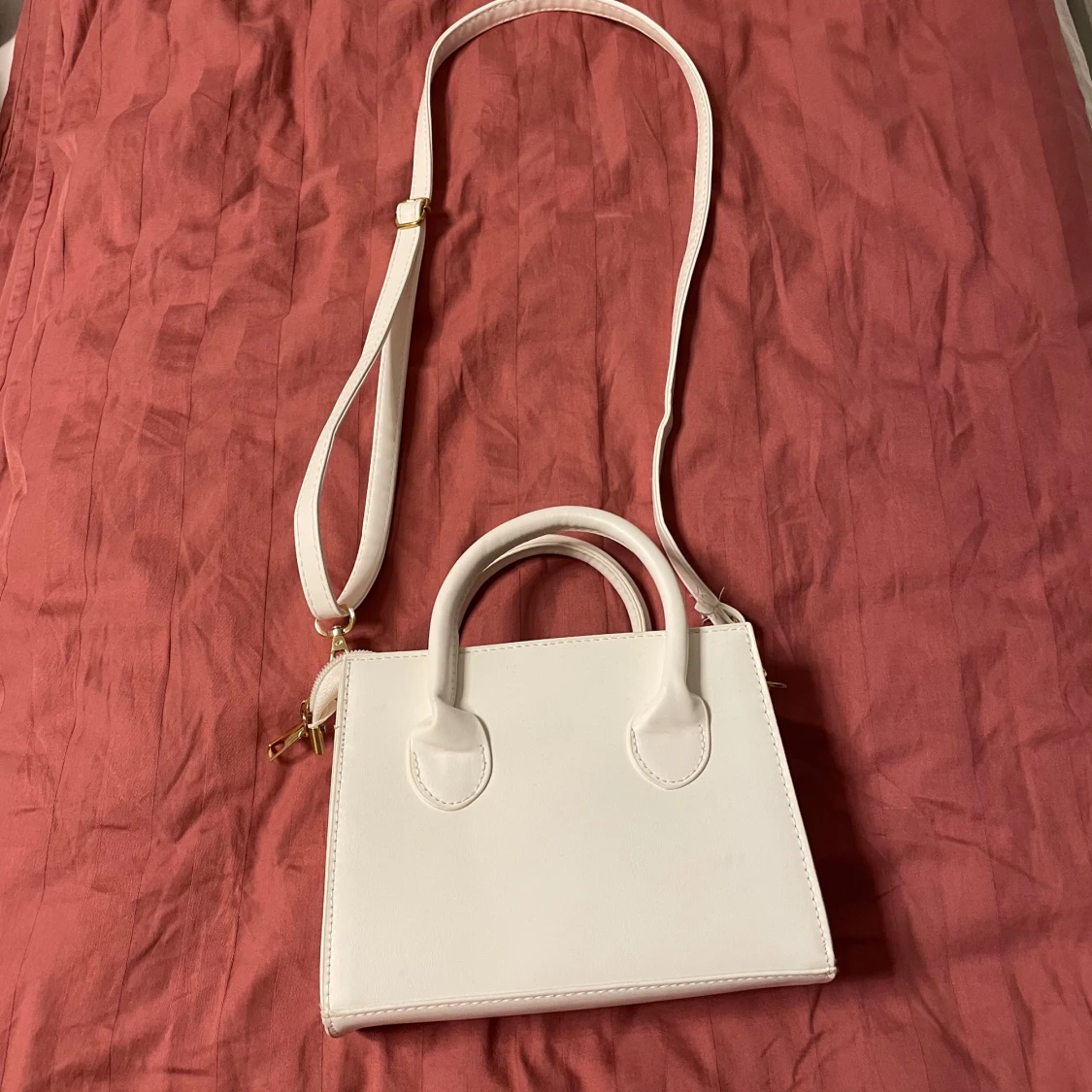 Stilren vit axelväska i syntetmaterial med både justerbar axelrem och två handtag. Väskan har en fyrkantig form och stängs med dragkedja i guld.