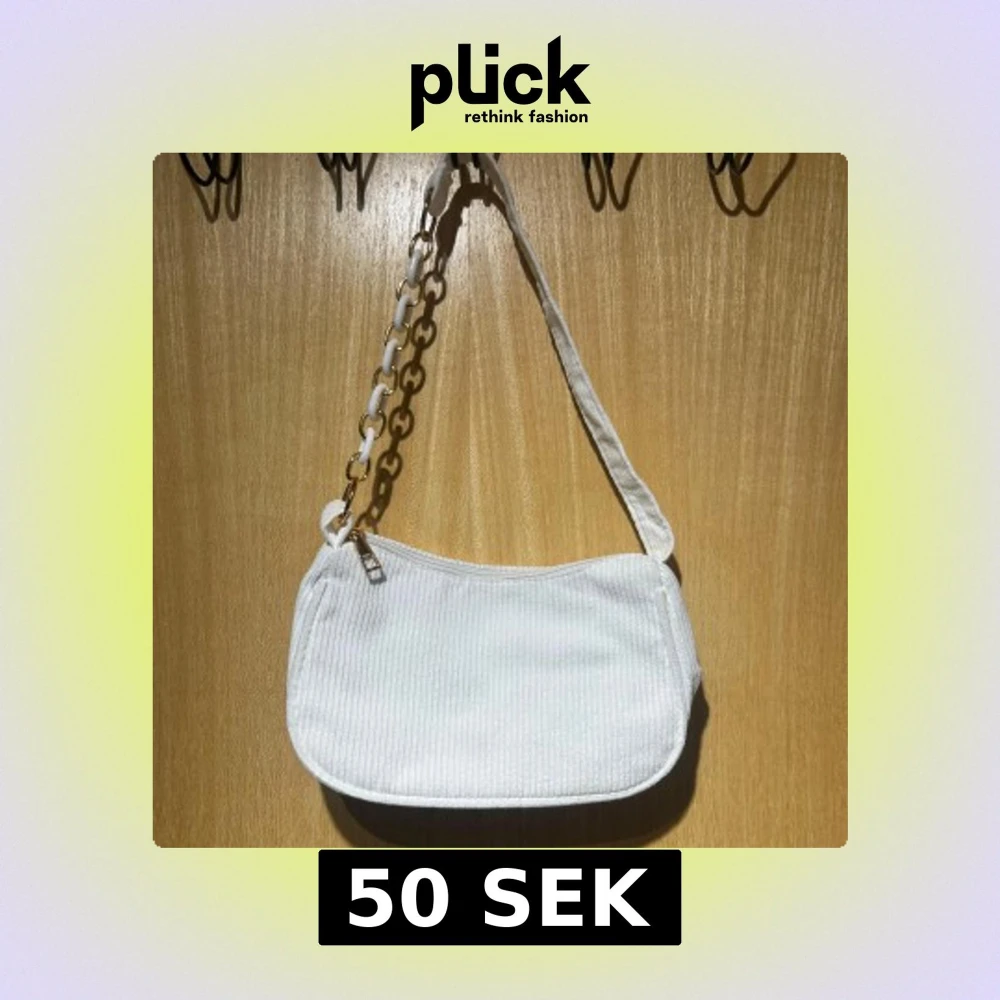 Snygg vit axelväska i manchester med guldfärgad och vit kedjedetalj på axelremmen. Väskan har en mjuk, rundad form och stängs med dragkedja upptill. Perfekt för att lyfta din outfit med en cool detalj.