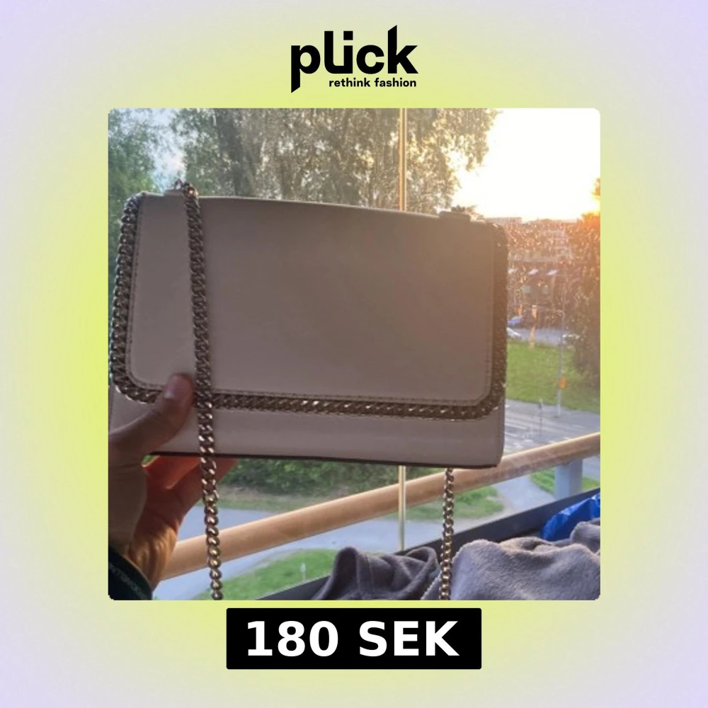 Snygg vit axelväska med silverfärgad kedja som axelrem och runt kanterna. Väskan har ett rött innerfoder och ett fack med dragkedja. Stilren och modern design, perfekt för dig som gillar att sticka ut med accessoarer. Säljer den eftersom ingen hemma använder den