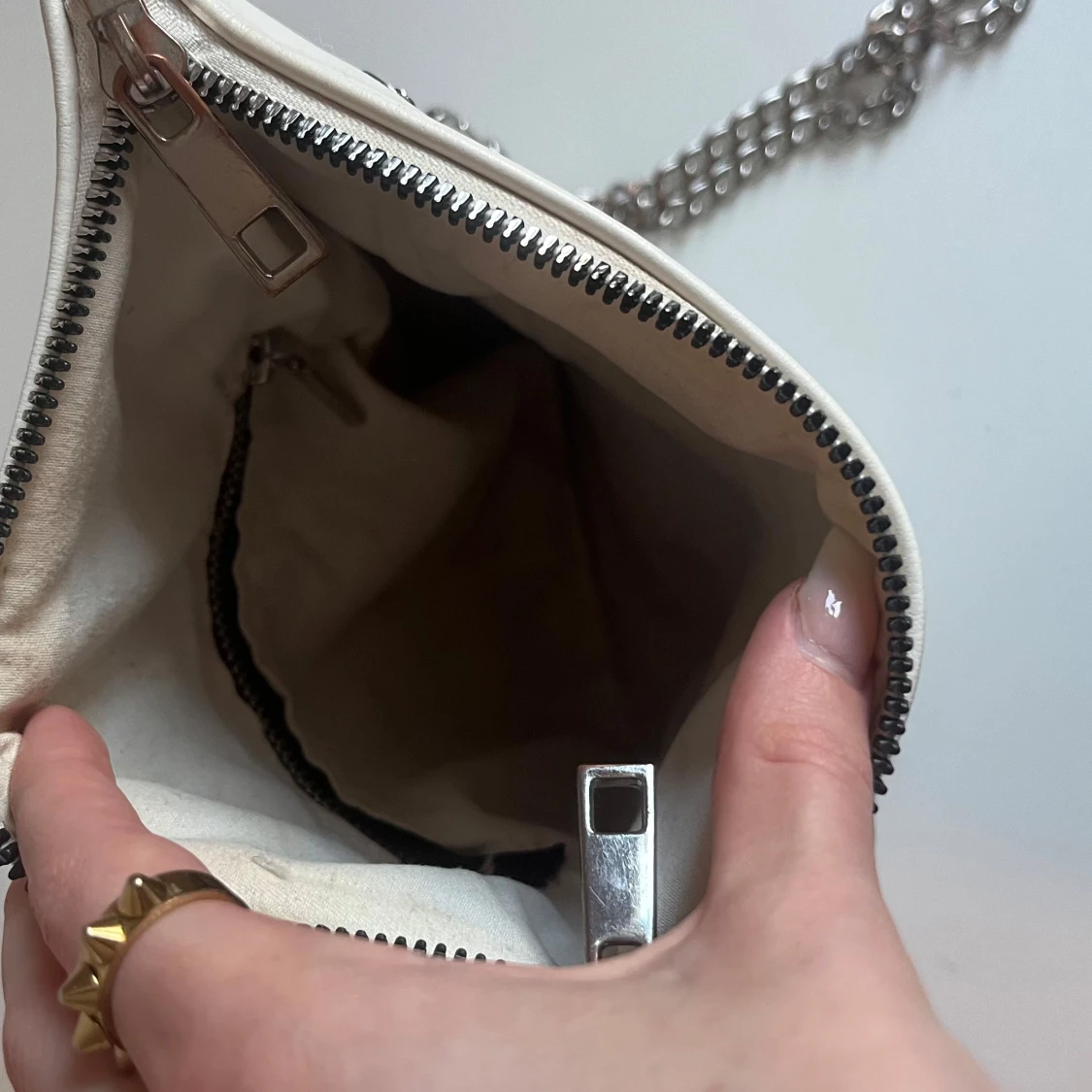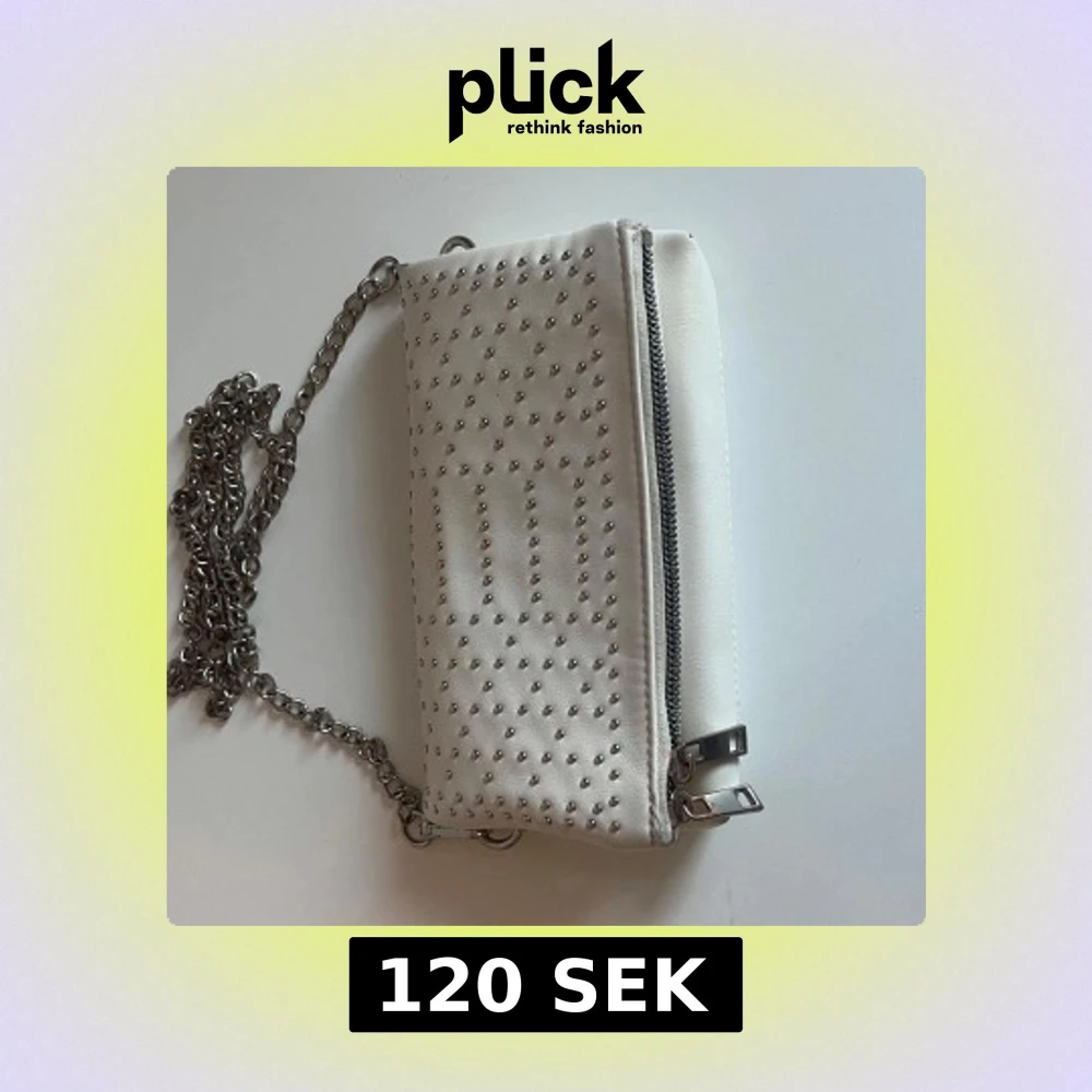 Säljer en vit axelväska med silverfärgade nitar på framsidan och en grov silverkedja som axelrem. Väskan har dragkedja upptill och är perfekt för att bära det viktigaste. Snygg och trendig accessoar!