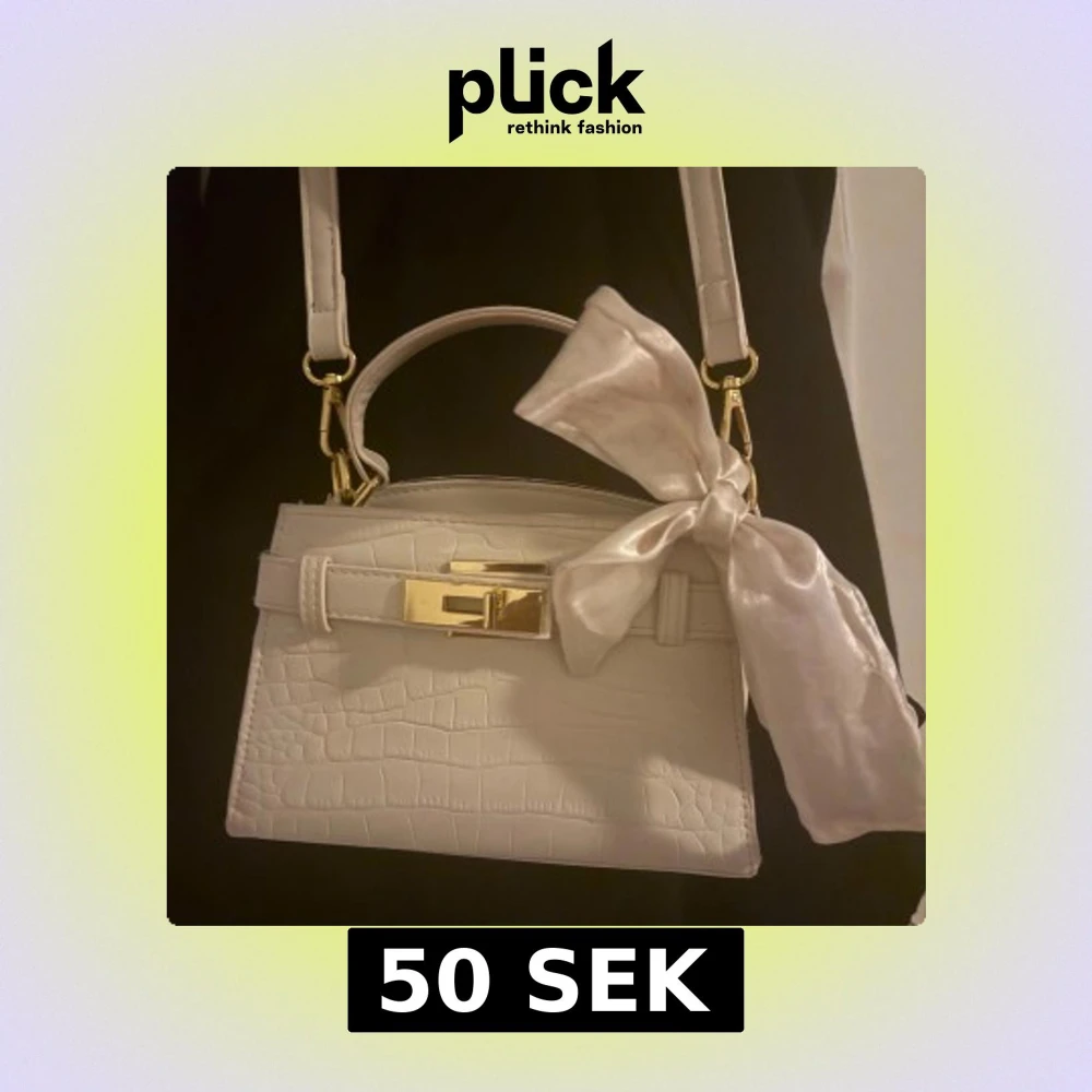 Säljer en stilren vit axelväska med krokopräglat mönster och snygga gulddetaljer. Väskan har både handtag och axelrem samt en stor, glansig rosett i sidenliknande material på sidan. Perfekt för dig som vill ha en trendig och elegant accessoar.