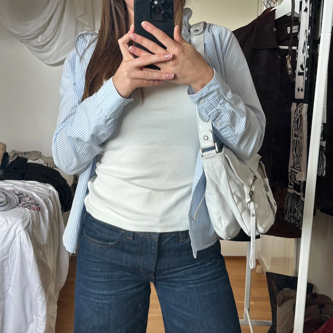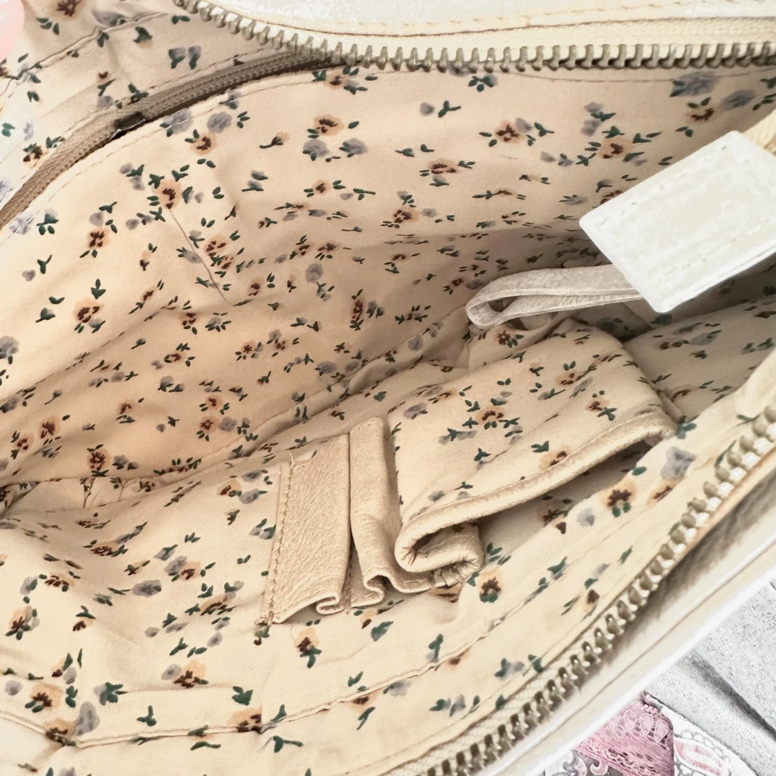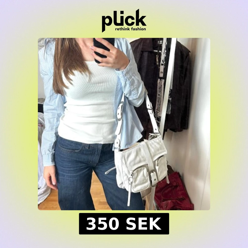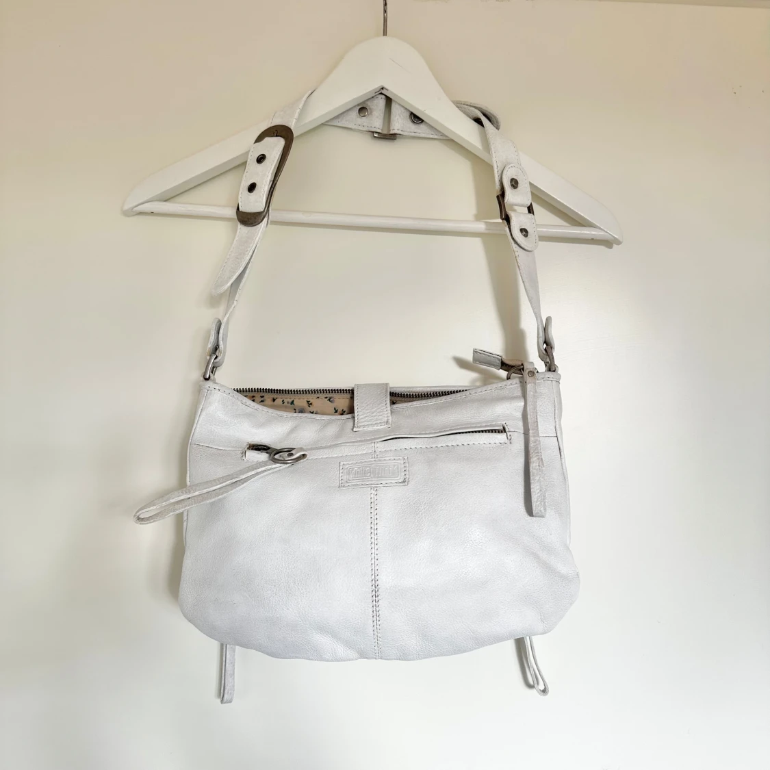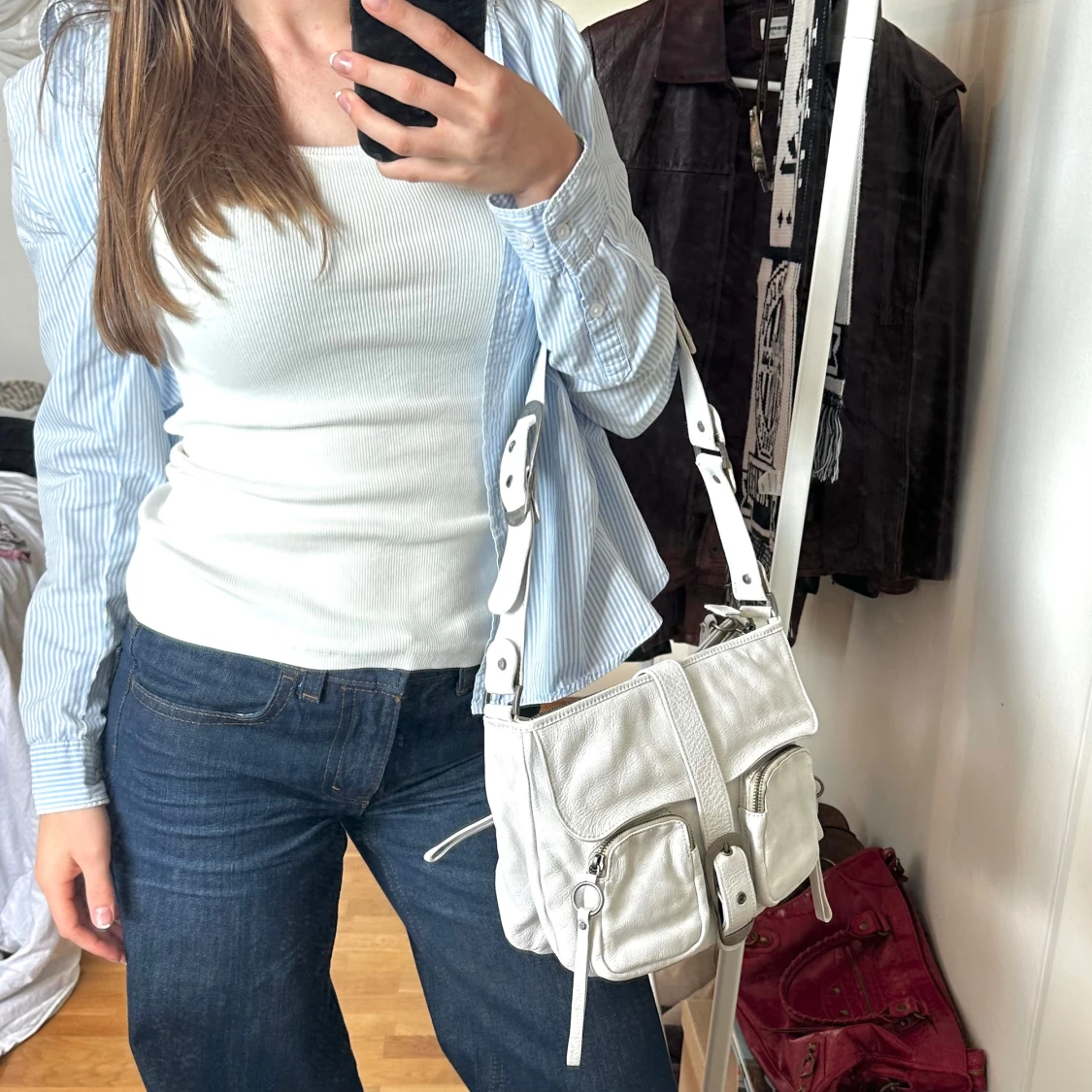 Snygg vit axelväska i mjukt skinn med justerbar rem och coola detaljer. Väskan har två framfickor med dragkedja, ett stort spänne och extra fack på baksidan. Den rymmer verkligen allt man behöver.