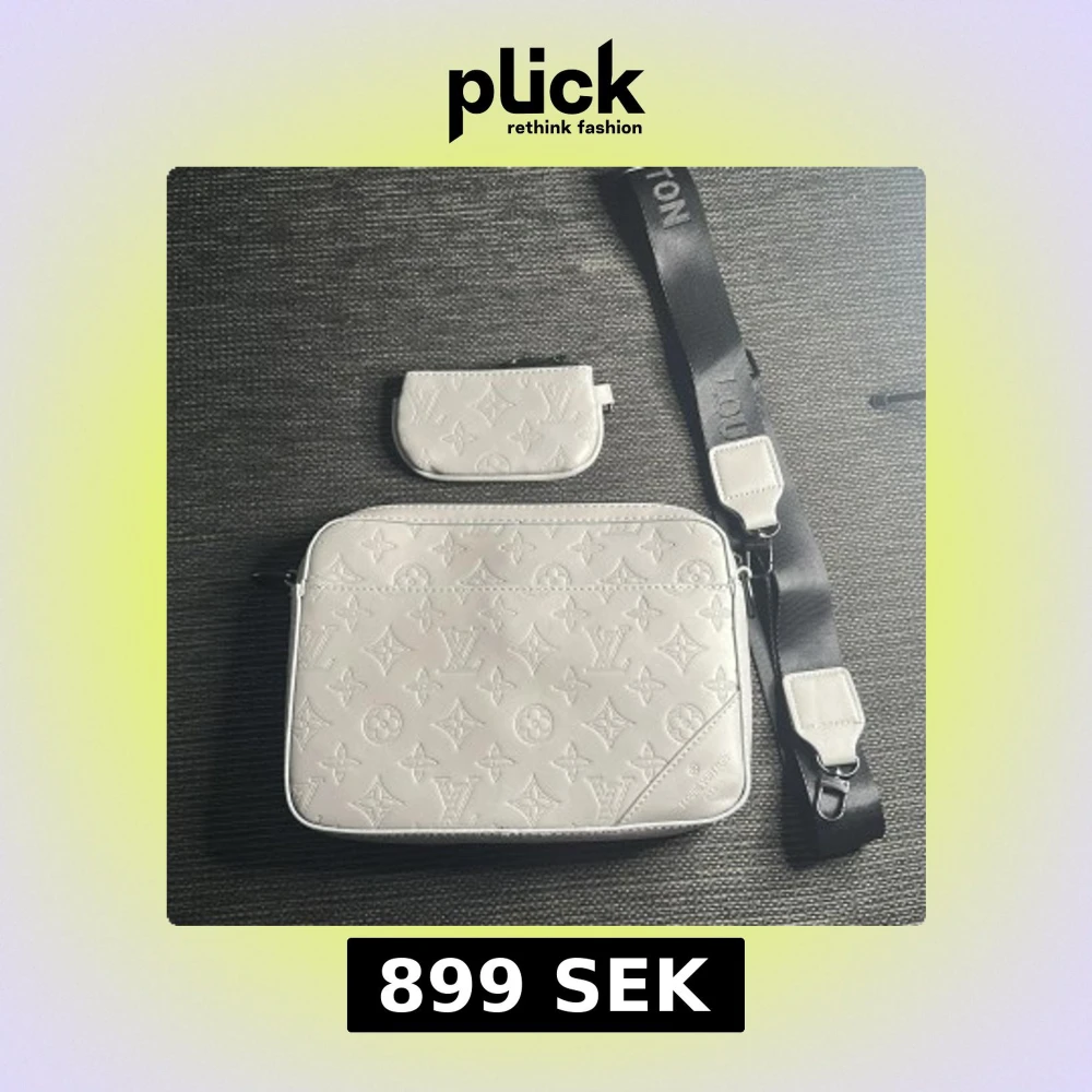 Snygg vit axelväska i skinn med klassiskt monogrammönster. Väskan har en bred svart axelrem och matchande liten plånbok. Perfekt för dig som vill ha en stilren och lyxig accessoar med ikonisk design.
