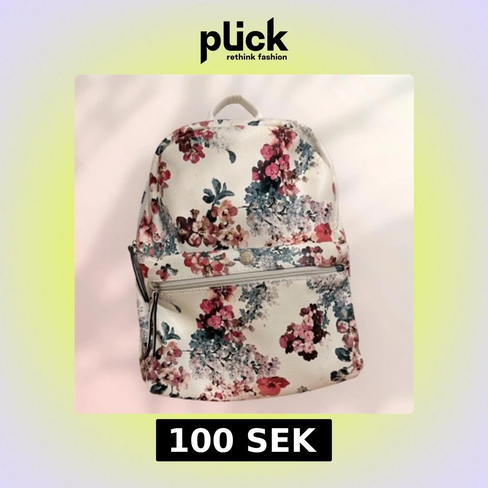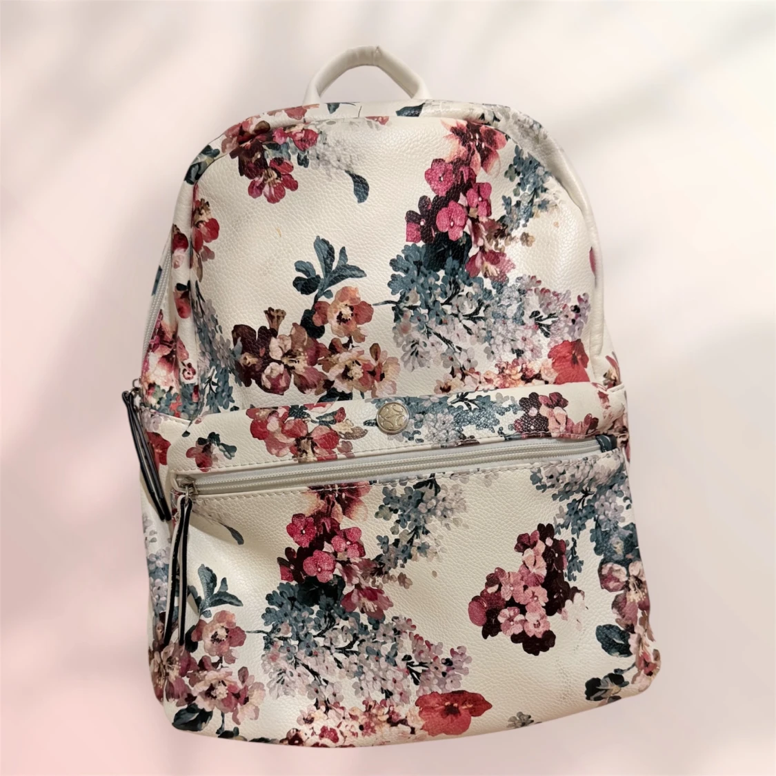 Superfin ryggsäck i vitt med blommigt mönster i rosa, rött och blått. Väskan har justerbara axelband, praktiskt ytterfack med dragkedja och är tillverkad i ett syntetmaterial med lätt struktur. Perfekt för dig som vill ha en söt och unik accessoar till vardagen.