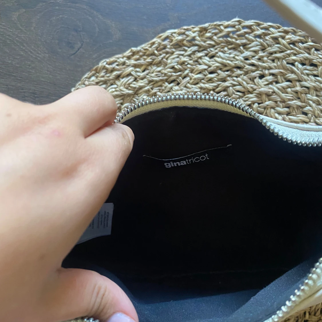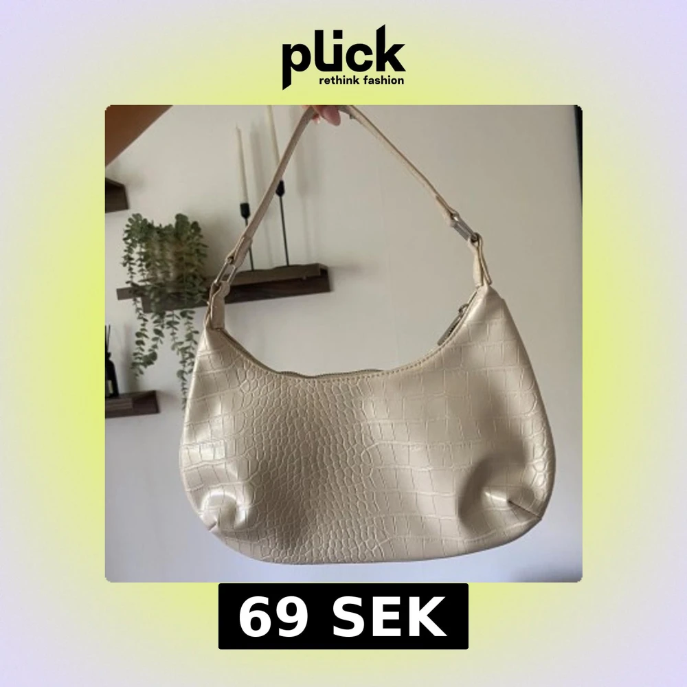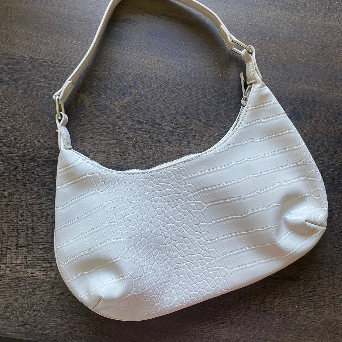 Snygg cremevit axelväska från Gina Tricot med crocopräglat mönster och dragkedja upptill. Väskan har en stilren, rundad form och ett kort axelband med silvriga metalldetaljer. Knappt använd