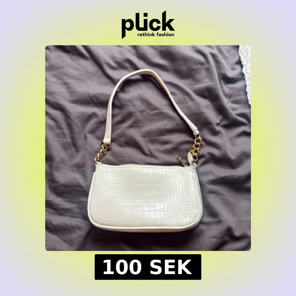 Snygg vit axelväska med krokodilmönstrad yta och guldfärgade kedjedetaljer på axelremmen. Väskan har en praktisk dragkedja upptill och en stilren, rektangulär form som gör den enkel att matcha med olika outfits. Perfekt storlek för det viktigaste.