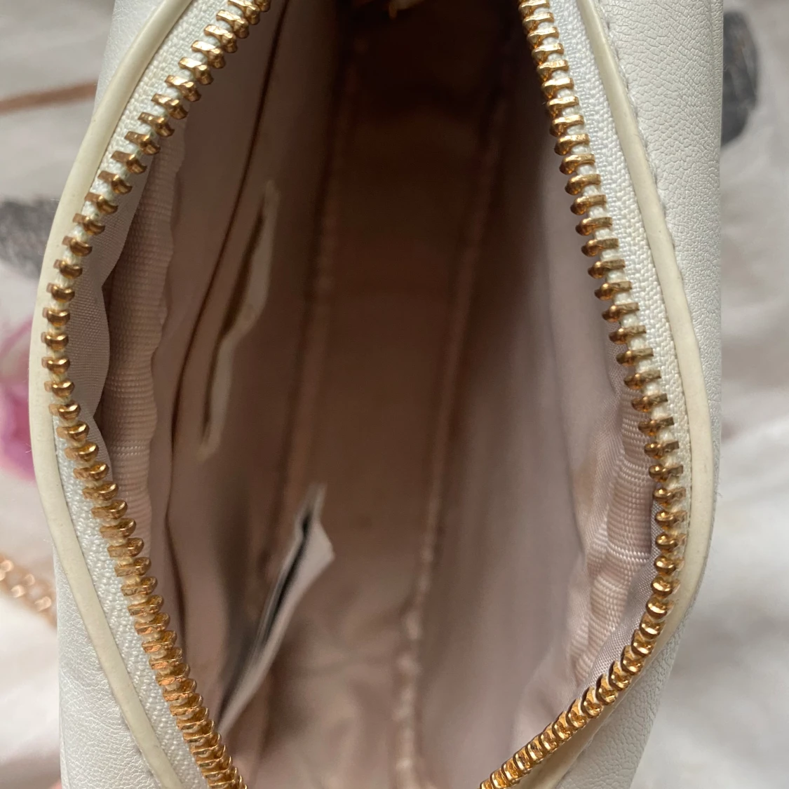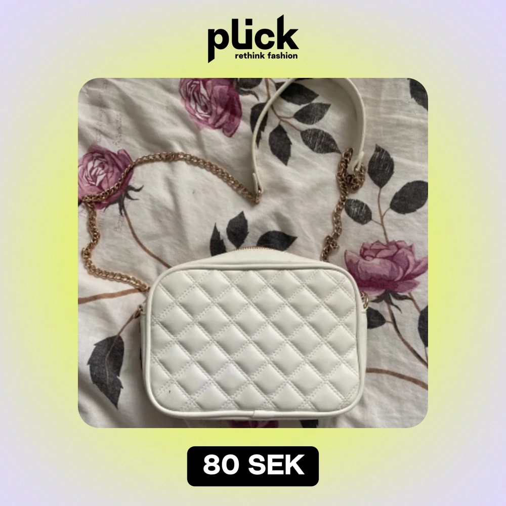 En vit liten handväska med guldig kedja. Den är i bra skick med några fläckar på insidan.