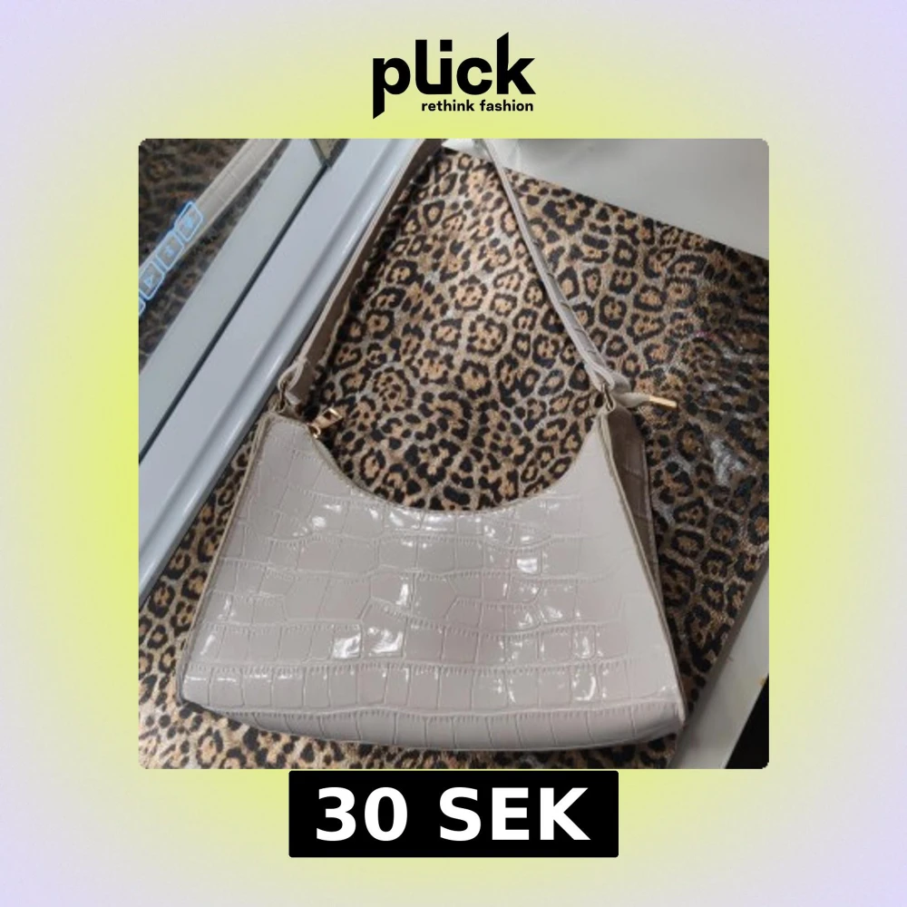 Snygg vit axelväska i glansigt syntetmaterial med croco-mönster. Väskan har guldfärgade detaljer och dragkedja upptill. Perfekt storlek för det viktigaste och en stilren look.