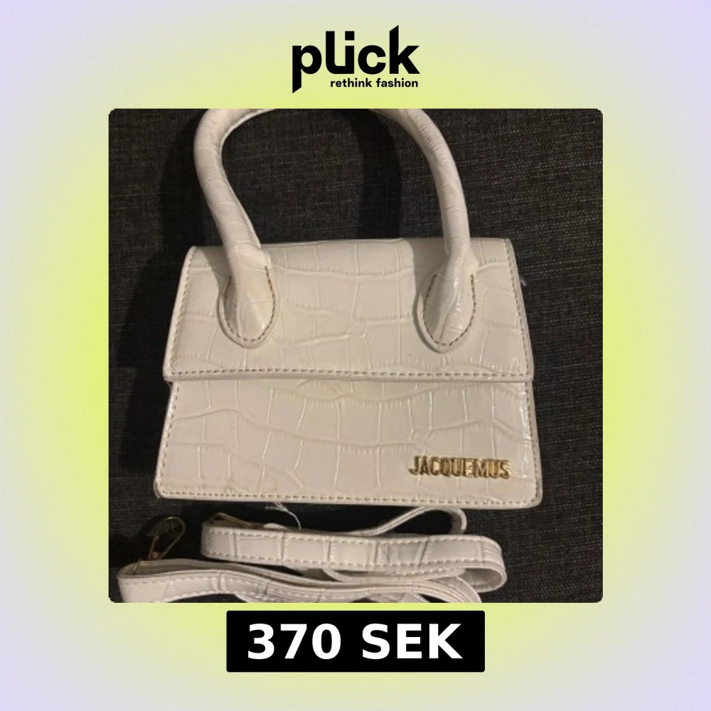 Vit handväska från Jacquemus med croco-mönstrad yta och guldfärgad logga framtill. Väskan är smutsig där bak men inget man lägger märke till.