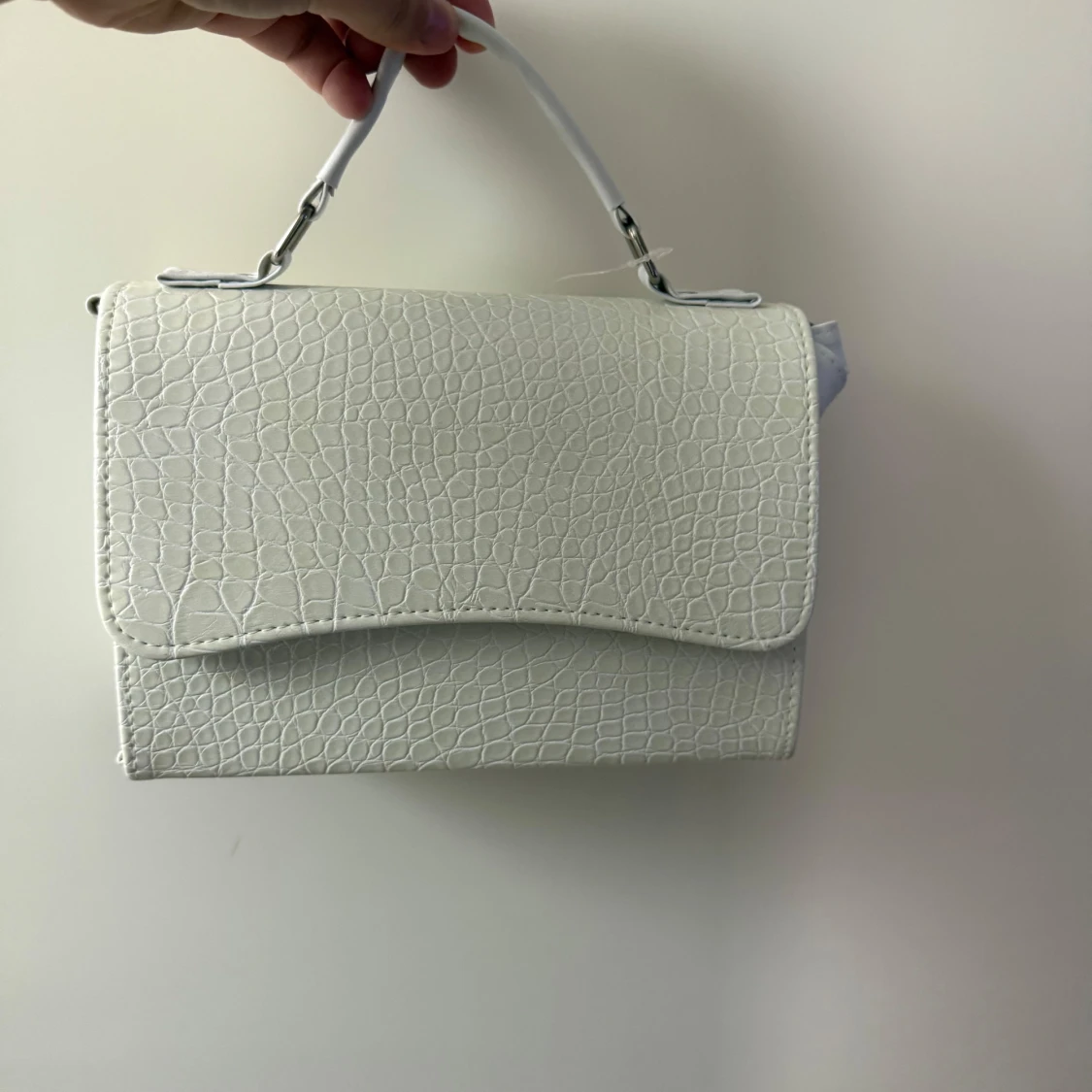Snygg vit handväska/axelväska med vitt band från Kobo med croco-mönstrad struktur och stilrent handtag. Väskan har en klassisk rektangulär form och är tillverkad i syntetmaterial. Perfekt för dig som vill ha en clean och trendig accessoar till din outfit.