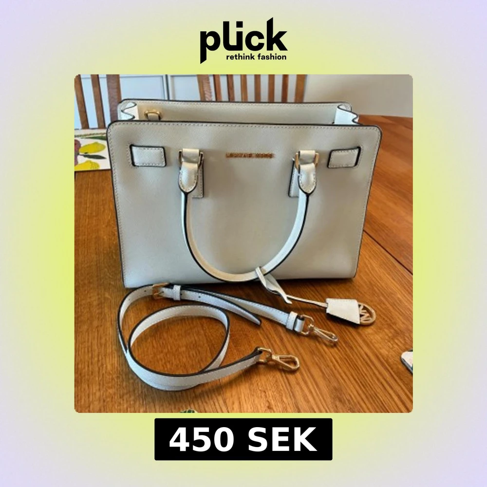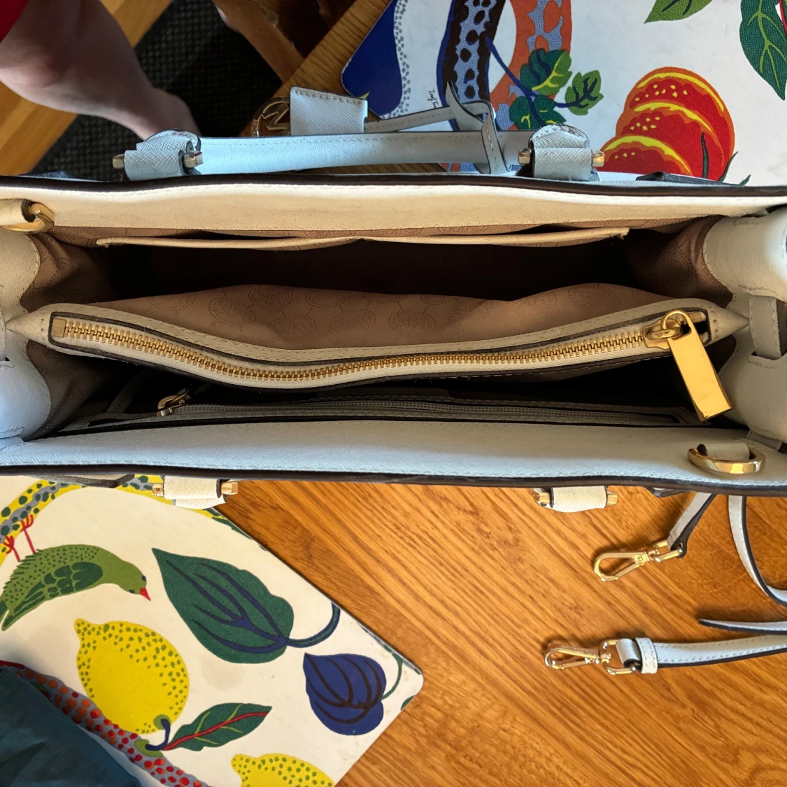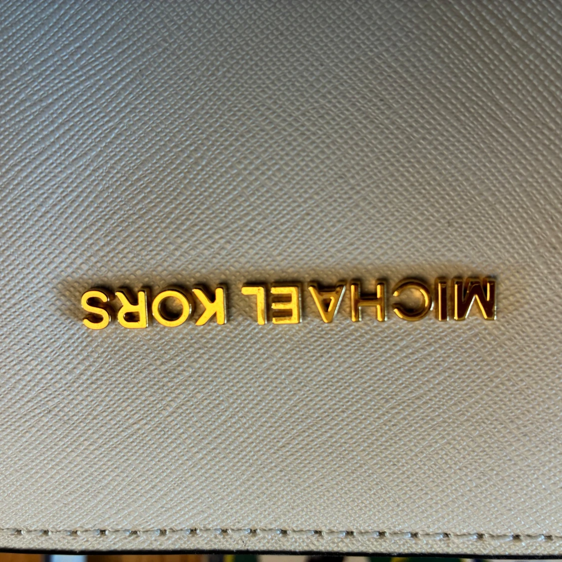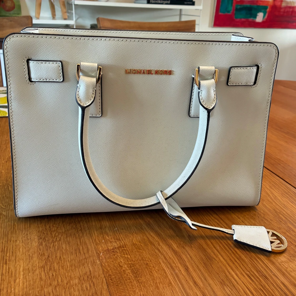 Snygg och stilren vit handväska från Michael Kors i skinn med guldiga detaljer. Väskan har både handtag och avtagbar axelrem, samt ett rymligt fack med dragkedja inuti. Klassisk fyrkantig form och diskret logga framtill. Äkta och oanvänd (avskedspresent från kollegor).