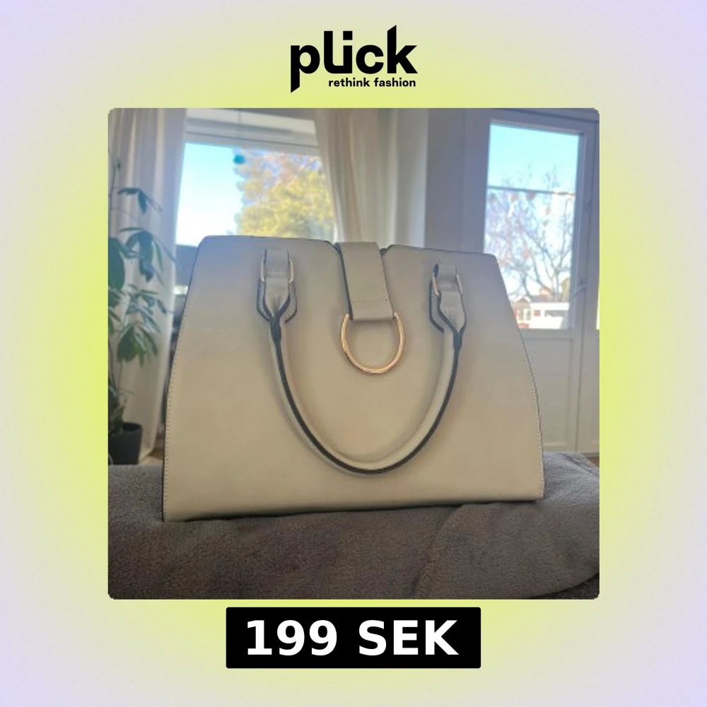 Stilren vit handväska med svarta kanter och snygga guldfärgade metalldetaljer. Väskan har två handtag och en dekorativ rem med guldfärgad ring framtill. Perfekt accessoar för att lyfta din outfit.
