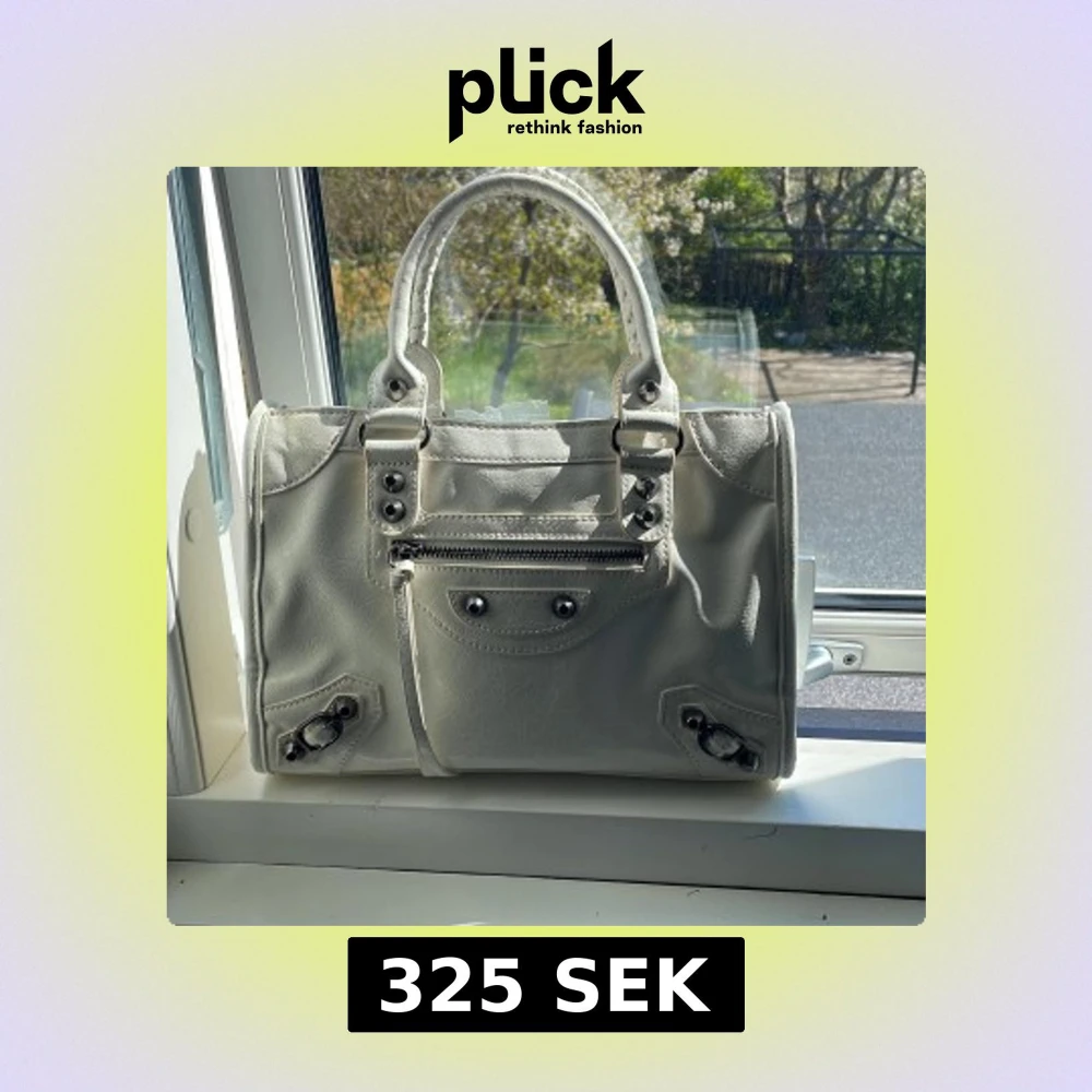 Säljer en stilren vit handväska med silverfärgade metalldetaljer och dragkedja framtill. Väskan har två handtag och dekorativa spännen i hörnen. Perfekt för dig som vill ha en klassisk accessoar med coola detaljer.